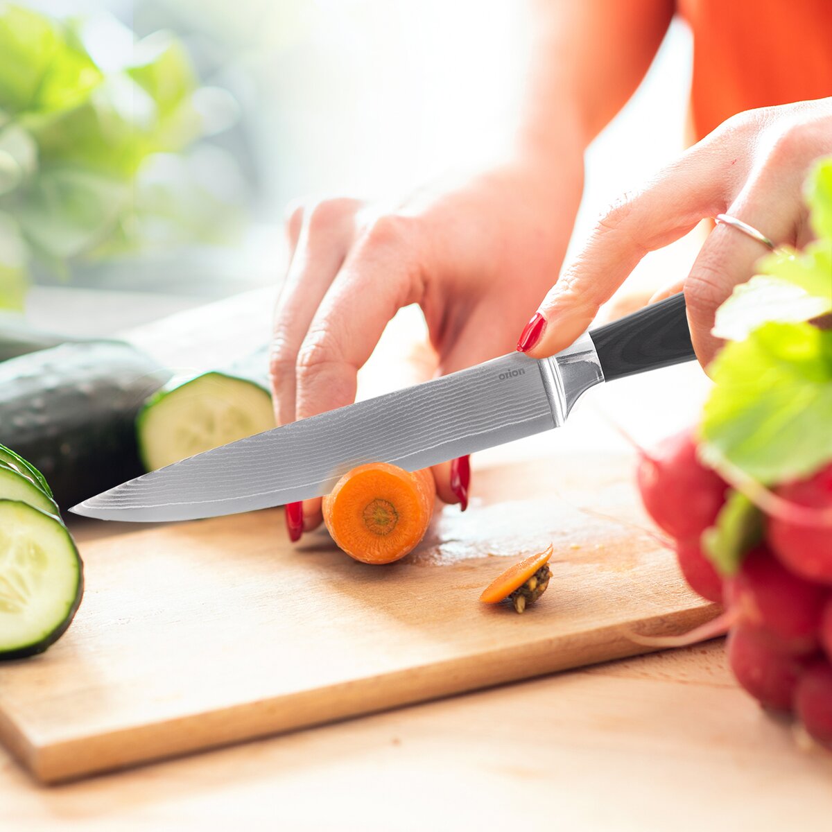 Nůž stačí po použití umýt v teplé vodě se saponátem, opláchnout a osušit. Pozor, nůž je ostrý, není hračka, používejte pouze ke krájení potravin. V případě nutnosti nabroušení ostří použijte kuchyňský brousek, ocílku.