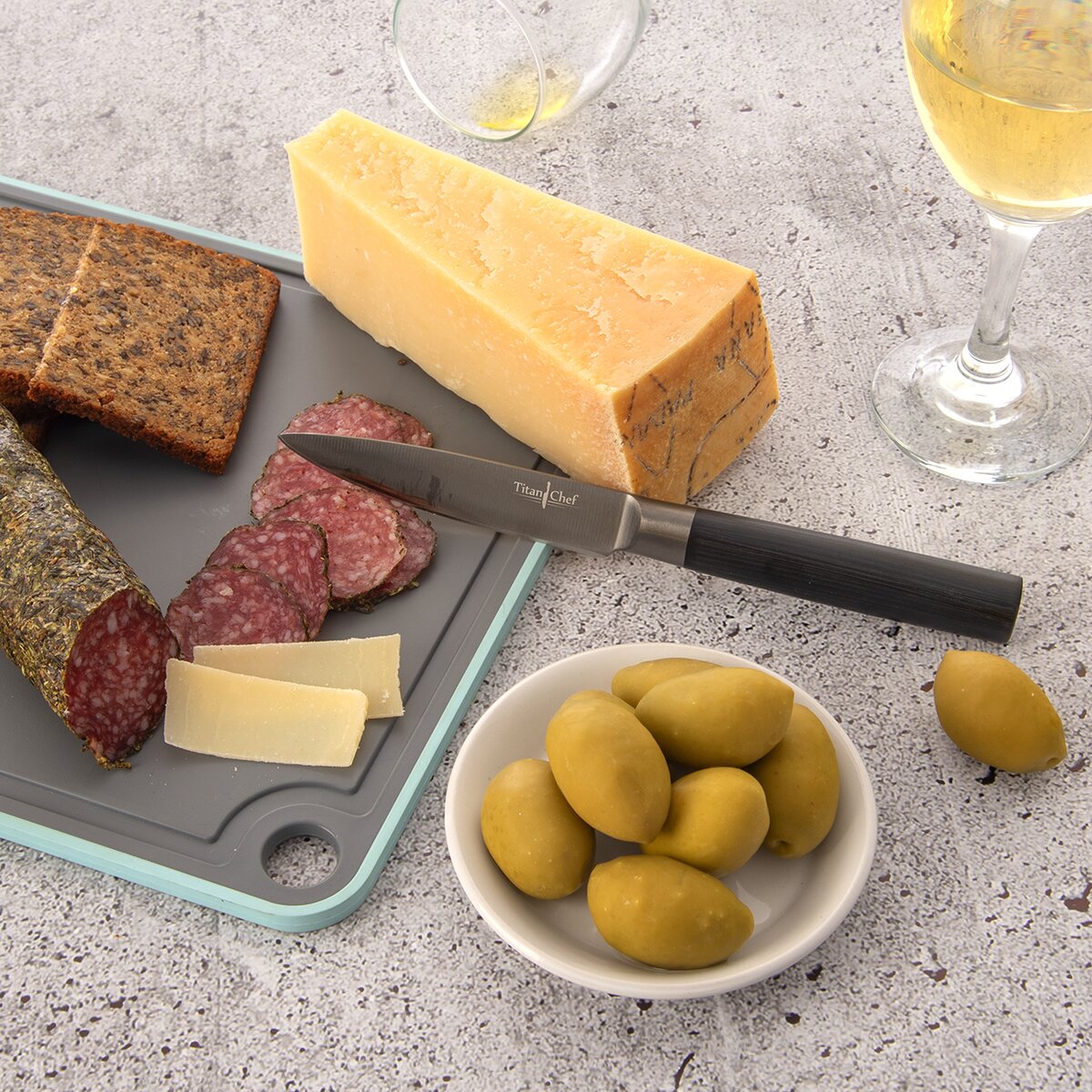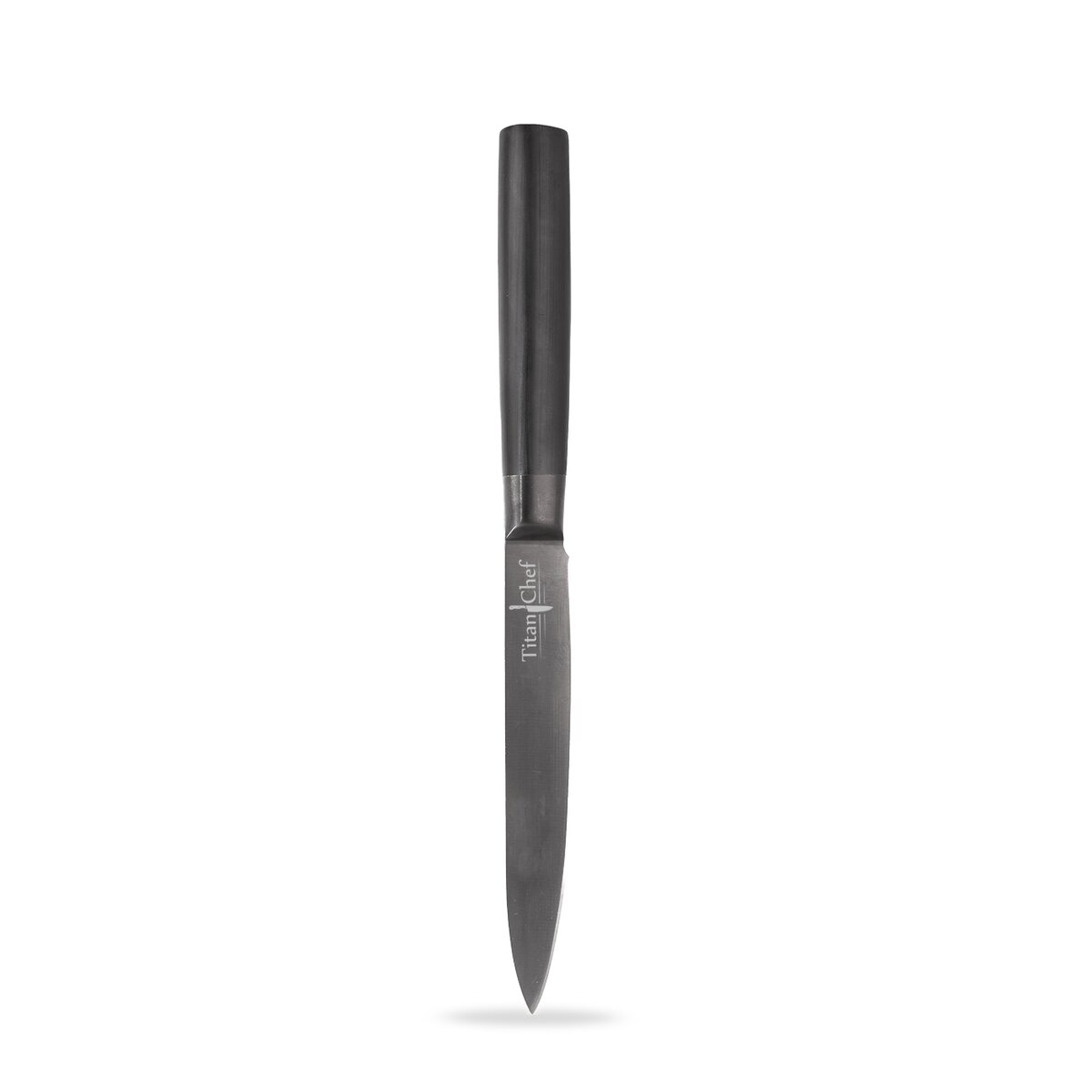 Kód produktu 831141Kvalitní nerezový kuchyňský nůž s tmavou titanovou vrstvou na 12,5 cm dlouhé čepeli a vyváženou plastovou rukojetí pro přesné krájení běžných surovin v kuchyni.