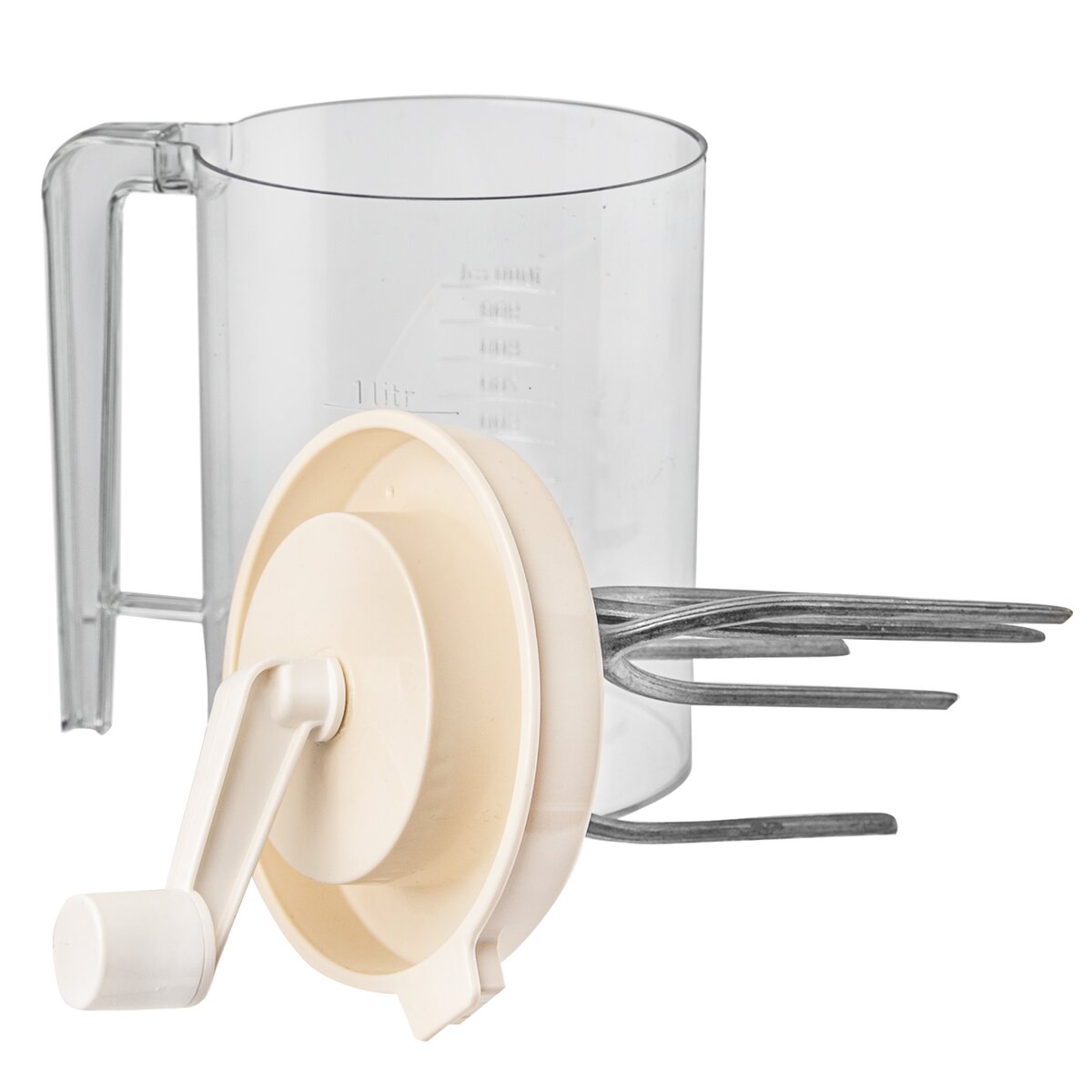 Kód produktu 130602Ruční kuchyňský šlehač z plastu o objemu 1,5 l, s měrnou stupnicí až do 1000 ml a šlehacími metlami z eloxovaného hliníku.