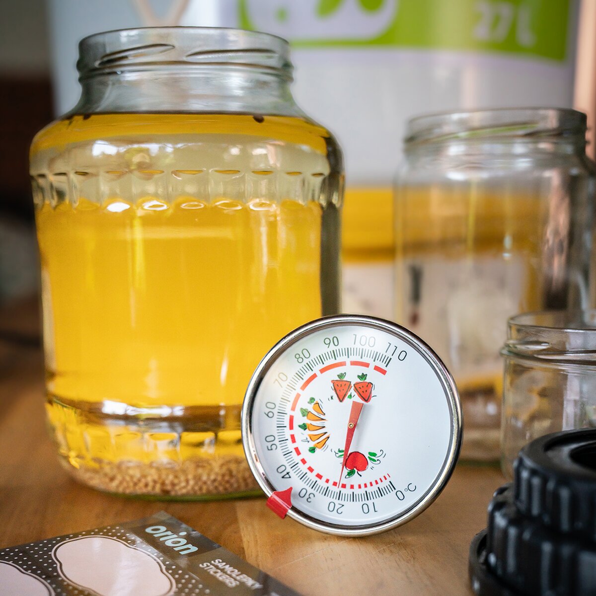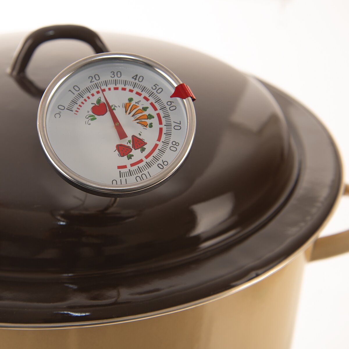 Ciferník je ozdobený ovocem poukazujícím na teplotu potřebnou k jeho zavaření. Posuvná červená šipka na okraji teploměru umožňuje označení požadované teploty. Součástí balení je gumová zarážka, která slouží k upevnění teploměru do středového otvoru na poklici hrnce. Druhou možností je jeho připevnění na okraj hrnce pomocí přiloženého klipu.