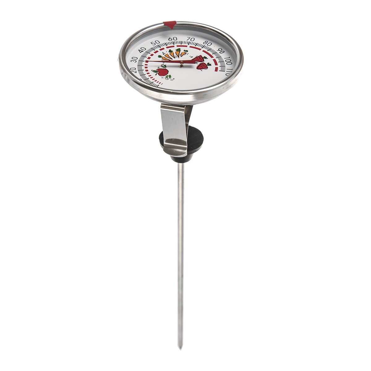 Kód produktu 152862Nerezový teploměr na zavařování s průměrem ciferníku 7,5 cm a celkovou délkou 28 cm. Součástí je gumová zarážka k upevnění do poklice a klip k připevnění na okraj hrnce.