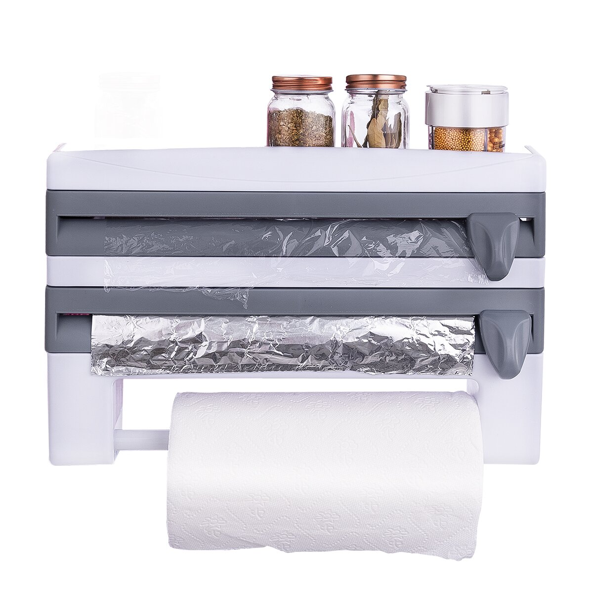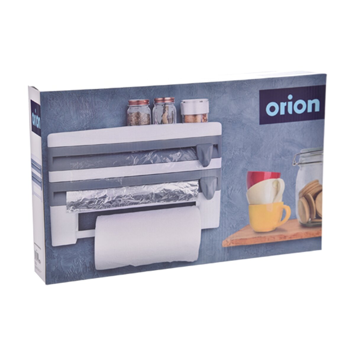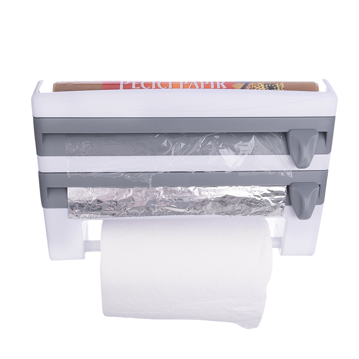 Kód produktu 154001Nástěnný zásobník do kuchyně 3v1 o rozměrech 38×8×25 cm. Je určený na potravinovou fólii, alobal a papírové utěrky.