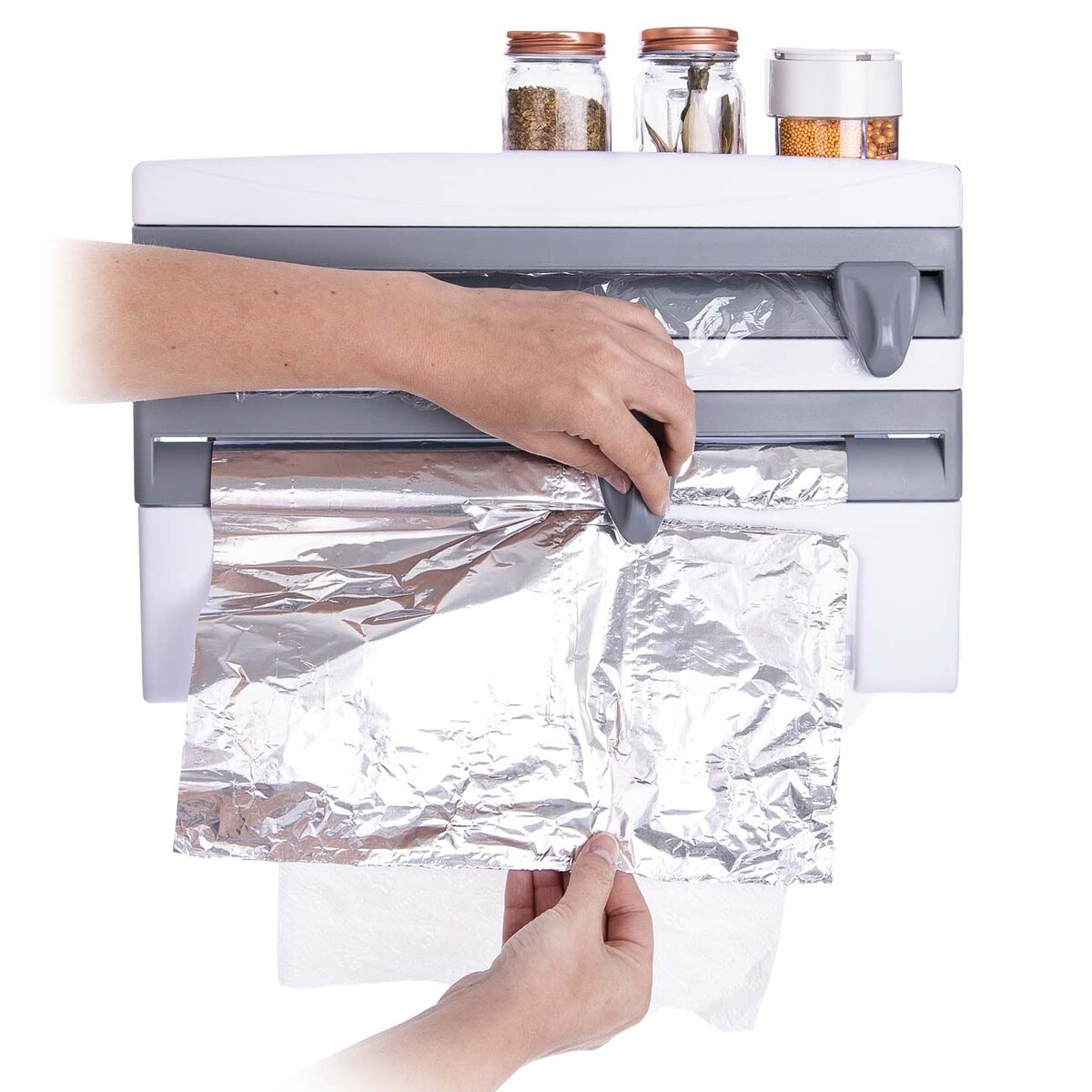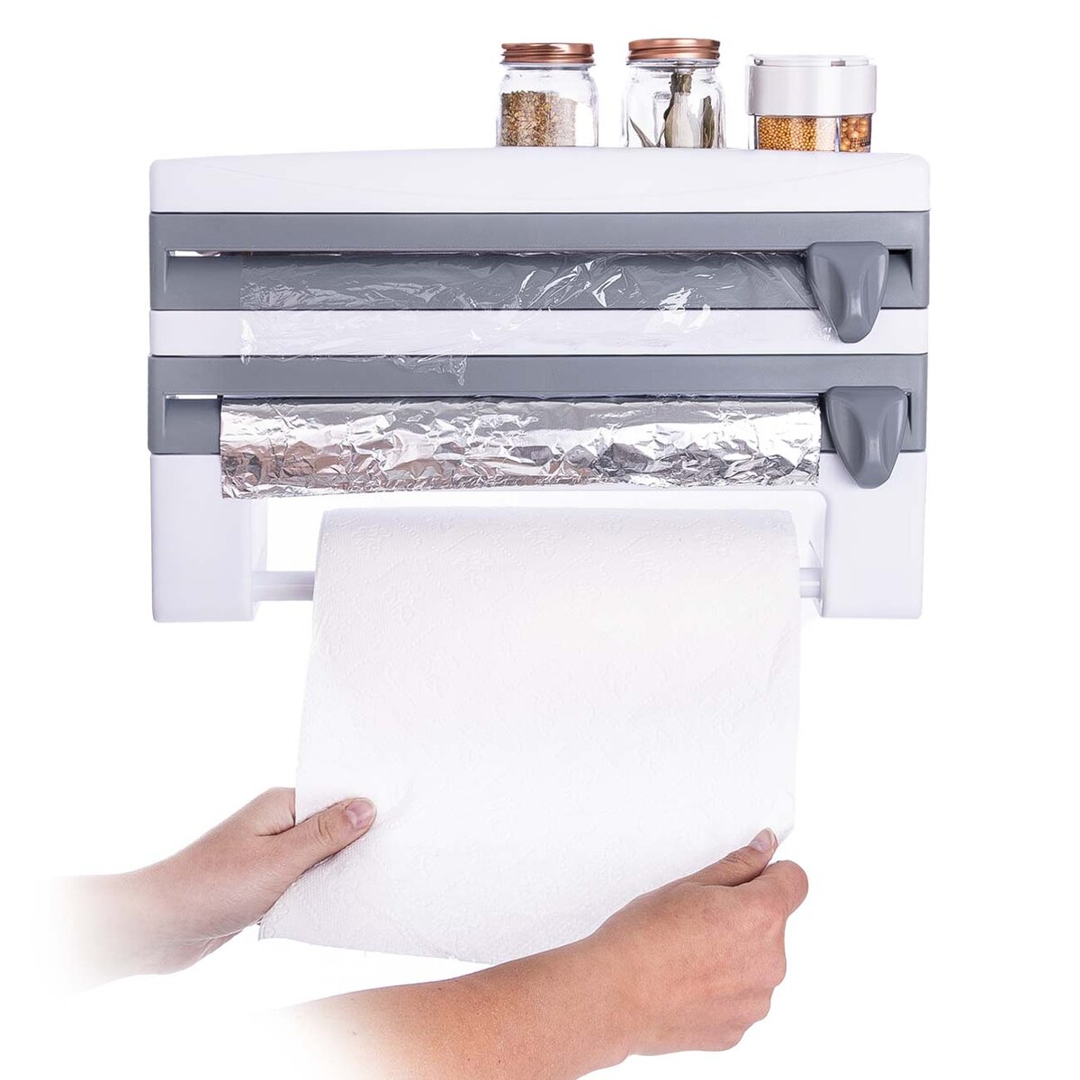 Více informacíTento nástěnný zásobník 3v1 se stane praktickým pomocníkem ve vaší kuchyni. Je rozdělen do několika částí. Do horní přihrádky můžete odložit pečicí papír, kořenky, kuchyňský teploměr nebo minutku. Další dvě přihrádky s nožíky slouží jako zásobníky na alobal a potravinářskou fólii, díky kterým potřebný kus pohodlně odříznete. Pro alobal je určený plastový nůž, naopak na fólii, která musí být během řezání napnutá, poslouží kovový nožík.