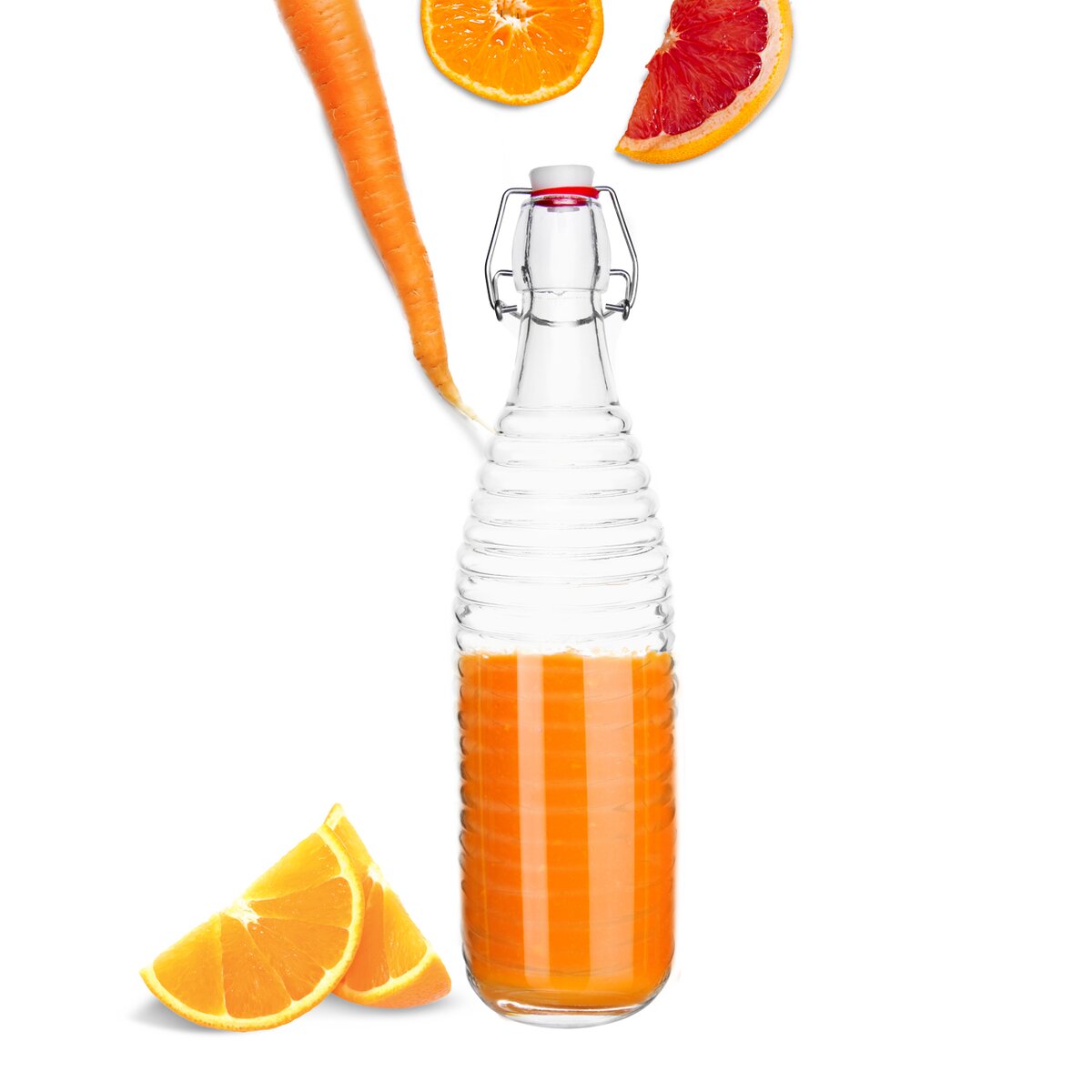 Kód produktu 126486Skleněná láhev ERIK o objemu 1 l s pákovým uzávěrem a plastickým dekorem.
