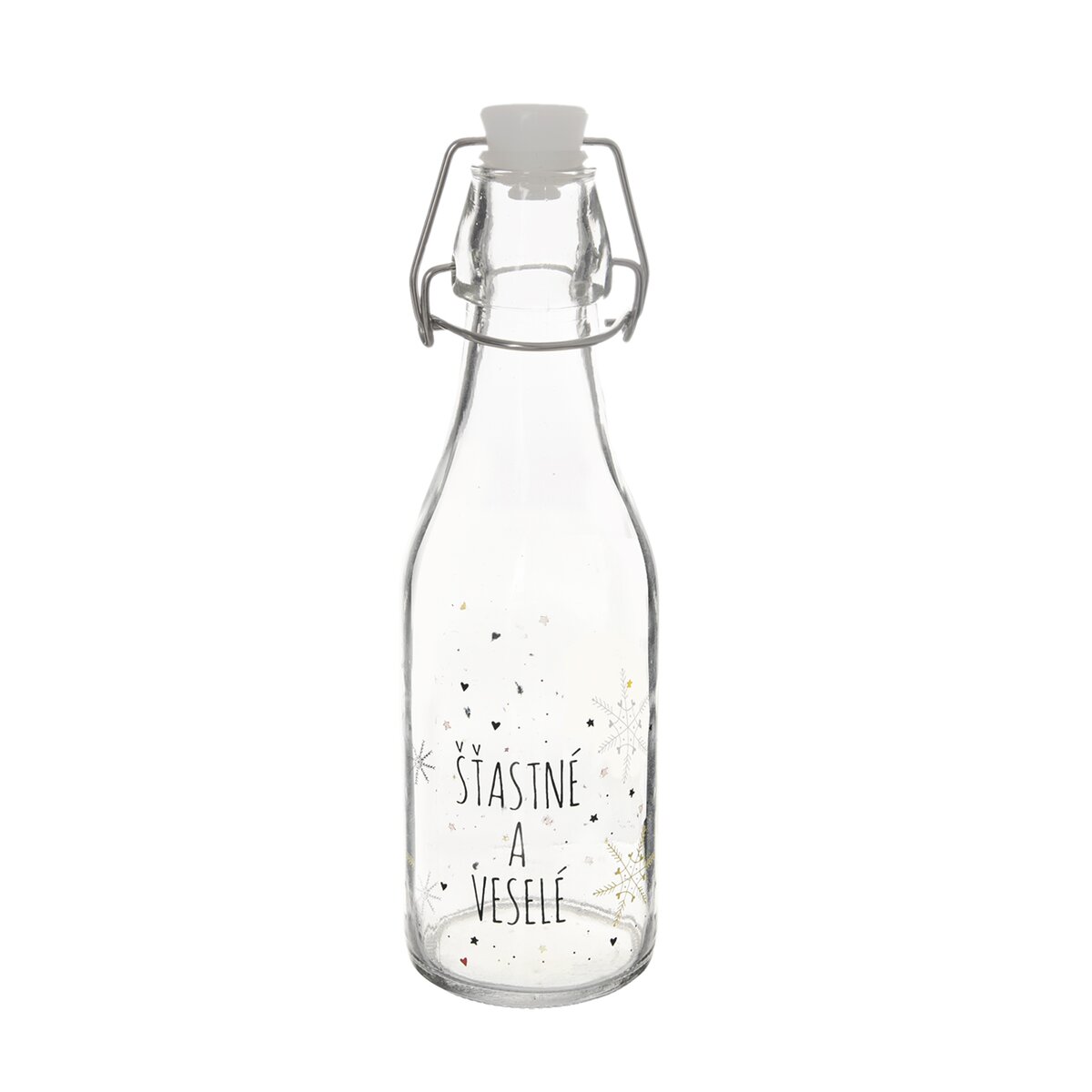 Kód produktu 152375Kulatá skleněná láhev VLOČKA o objemu 0,52 l má pákový uzávěr a silikonové těsnění. Zdobí ji dekor bílých a zlatých vloček a nápis ŠŤASTNÉ A VESELÉ. Je ideální k uložení nápojů typu vaječný koňak, punč, slivovice nebo domácího sirupu.