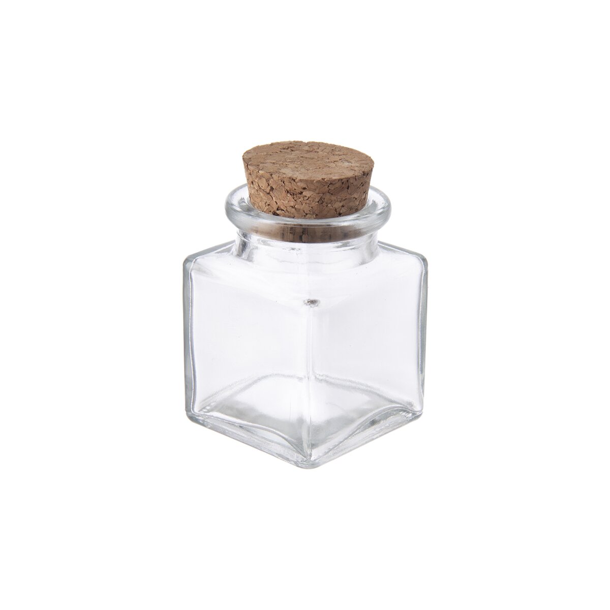 Kód produktu 143795Hranatá skleněná láhev o objemu 50 ml s korkovou zátkou je určena k uložení koření, semínek, sušených bylinek, koupelové soli a dalších drobností.
