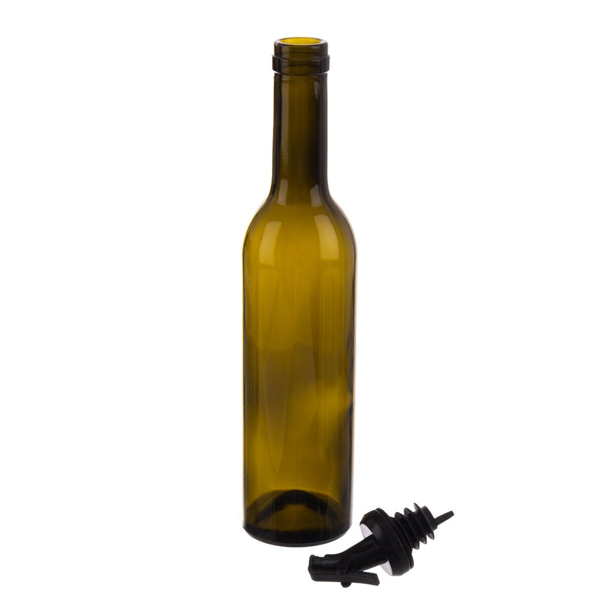 Kód produktu 127727Láhev z tmavého skla o objemu 0,38 l slouží k praktickému dávkování oleje nebo octa při vaření a dochucování pokrmů. Umožňuje díky nálevce přesnější nalévání.