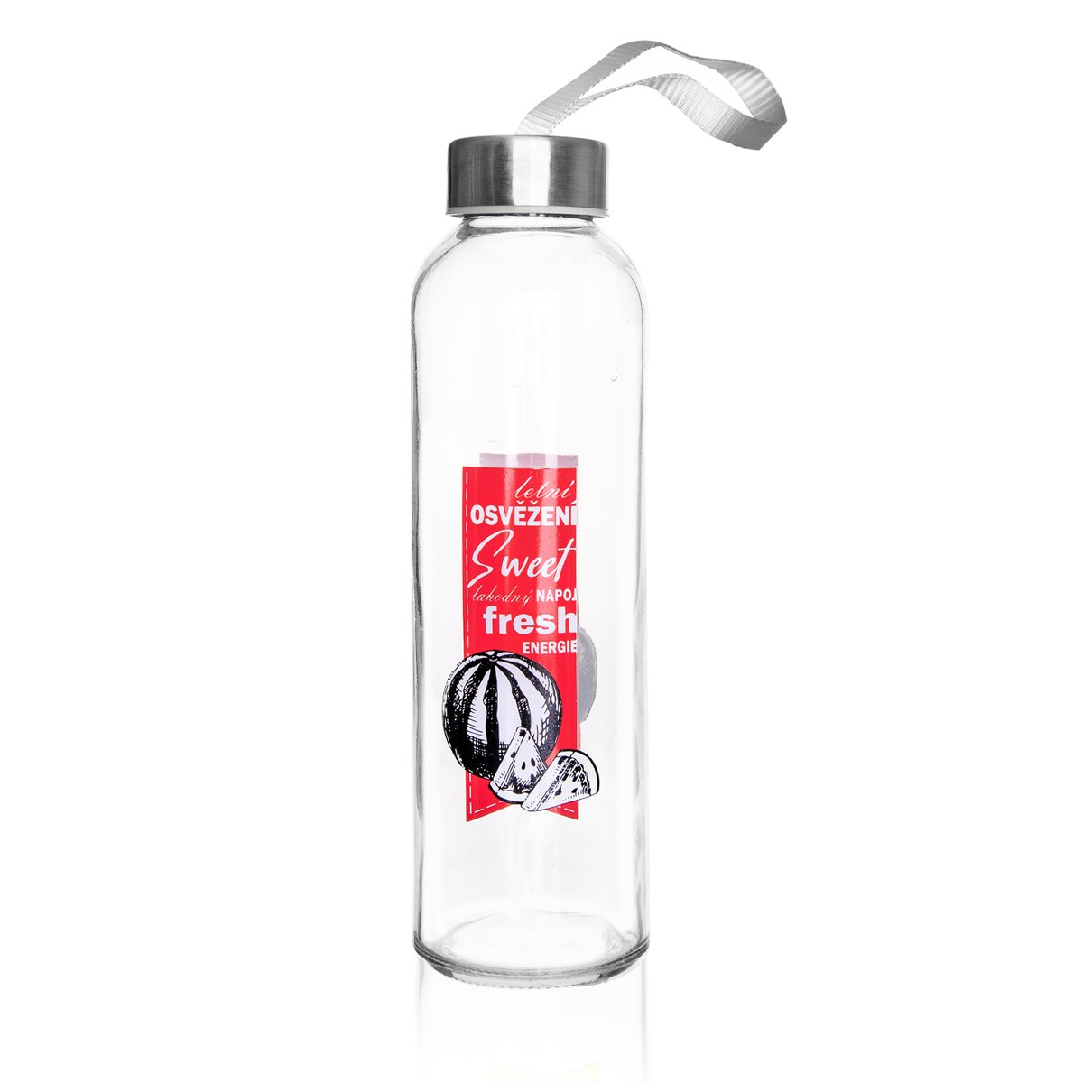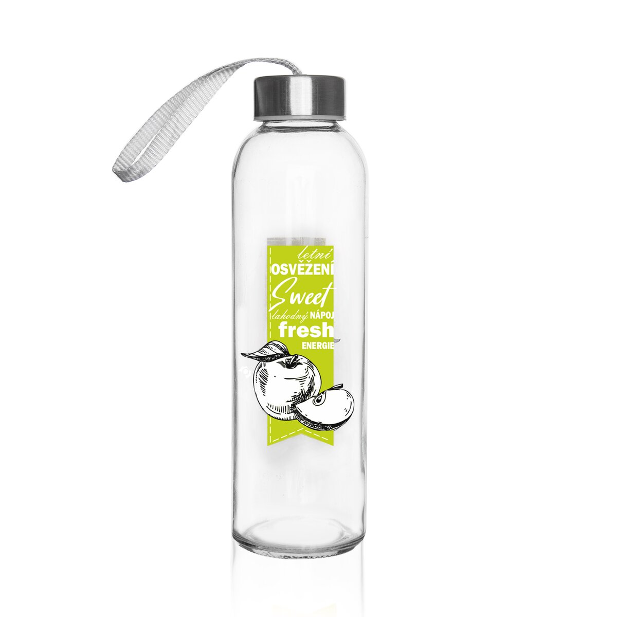 Kód produktu 125999Skleněná láhev FRESH o objemu 0,55 l s barevným dekorem a kovovým víčkem na závit.