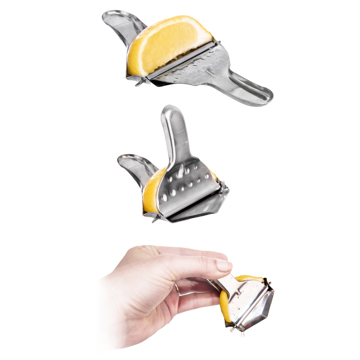Kód produktu 141909Nerezový lis na citrusy, který funguje na principu stlačení dílku citrónu.