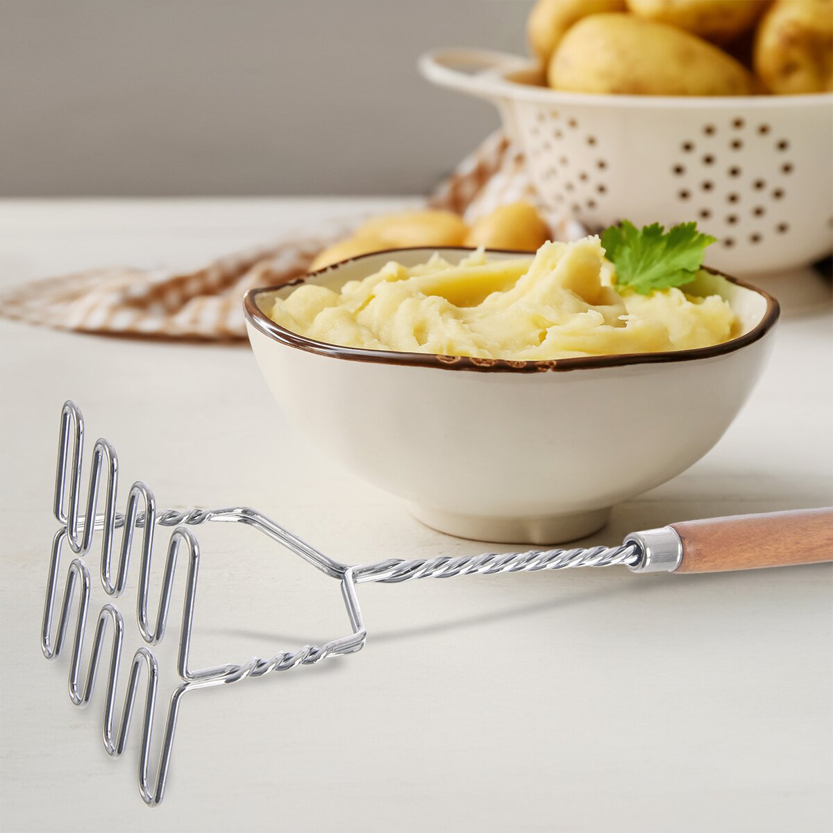 Kód produktu 143117Nerezové mačkadlo, nebo chcete-li šťouchadlo na brambory s dřevěnou rukojetí pomůže při přípravě bramborové kaše, šťouchaných brambor i přípravě těsta na bramborové placky či krokety.