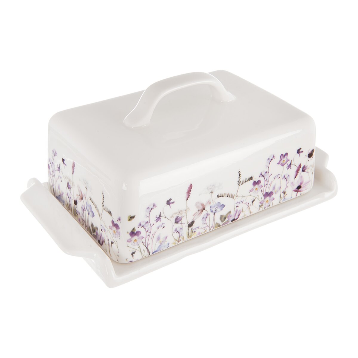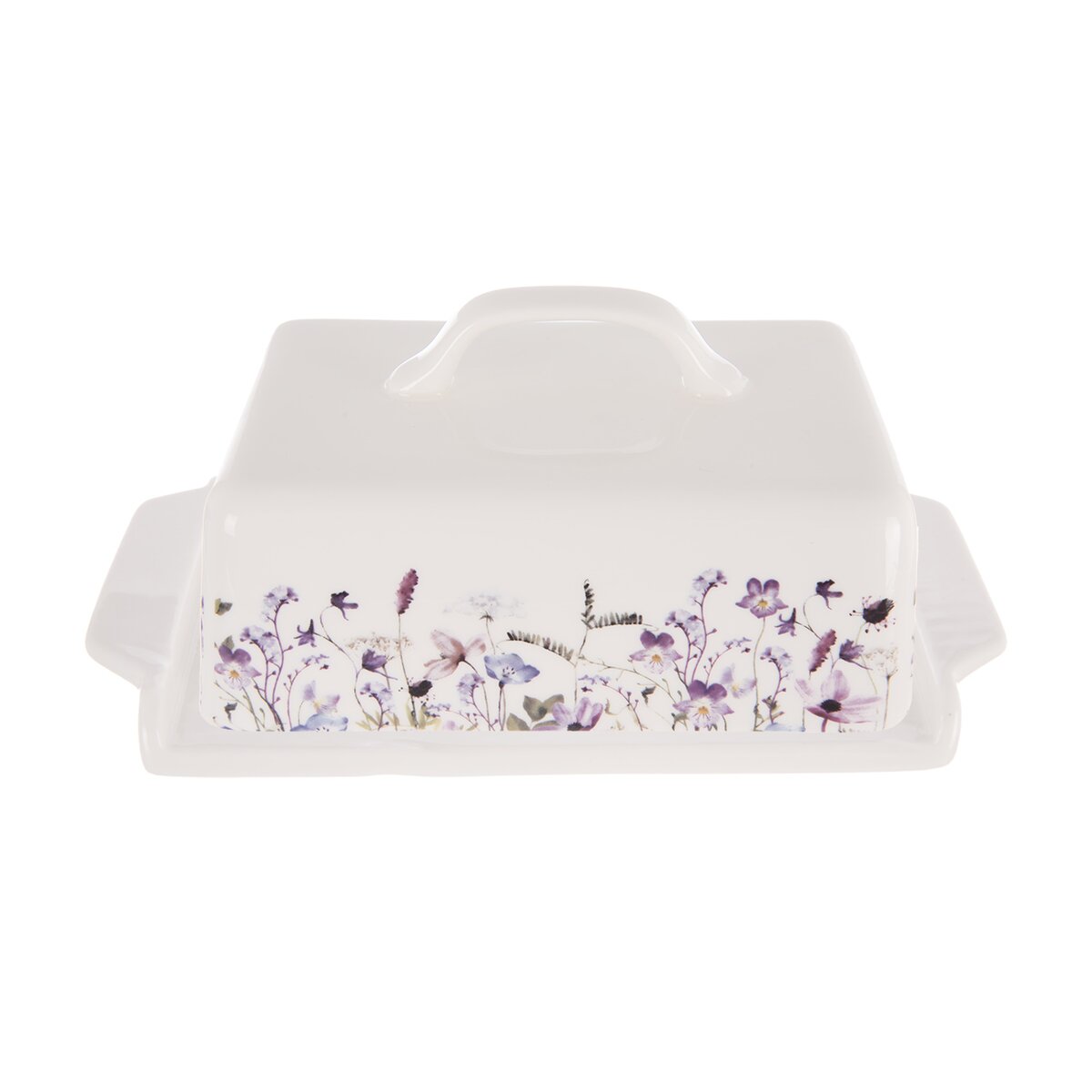 Nepraktické umaštěné obaly od másla, které se navíc při krájení často proříznou, nahradí jednoduše praktická bílá porcelánová máslenka s úchytem a spodní samostatnou částí, na kterou lze kostku másla položit. Navíc je zdobena něžným dekorem lučních květin v modrých a fialových odstínech.