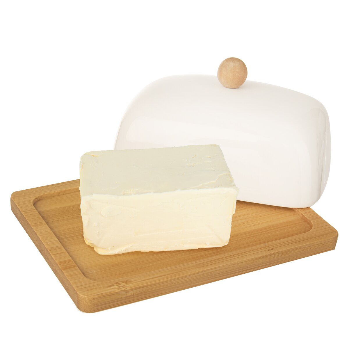 Nepraktické umaštěné obaly od másla, které se navíc při krájení často proříznou, nahradí jednoduše praktická bílá porcelánová máslenka s úchytem a spodní částí z bambusu.