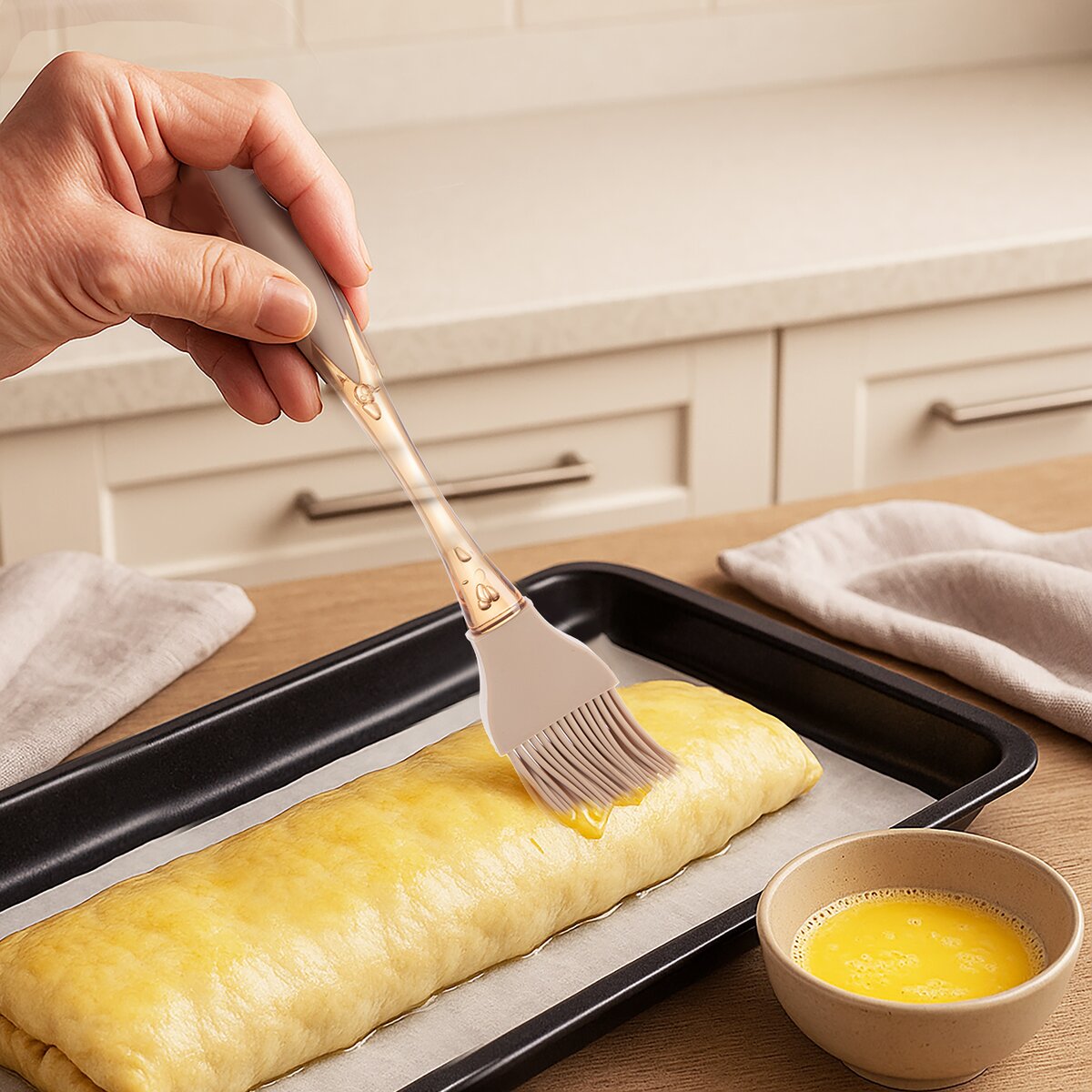 Pomůže s potíráním domácího chleba v troubě vodou či mlékem pro dosažení lesklé kůrky, nebo perníčků, koláčů, jablečného závinu rozšlehaným vajíčkem.