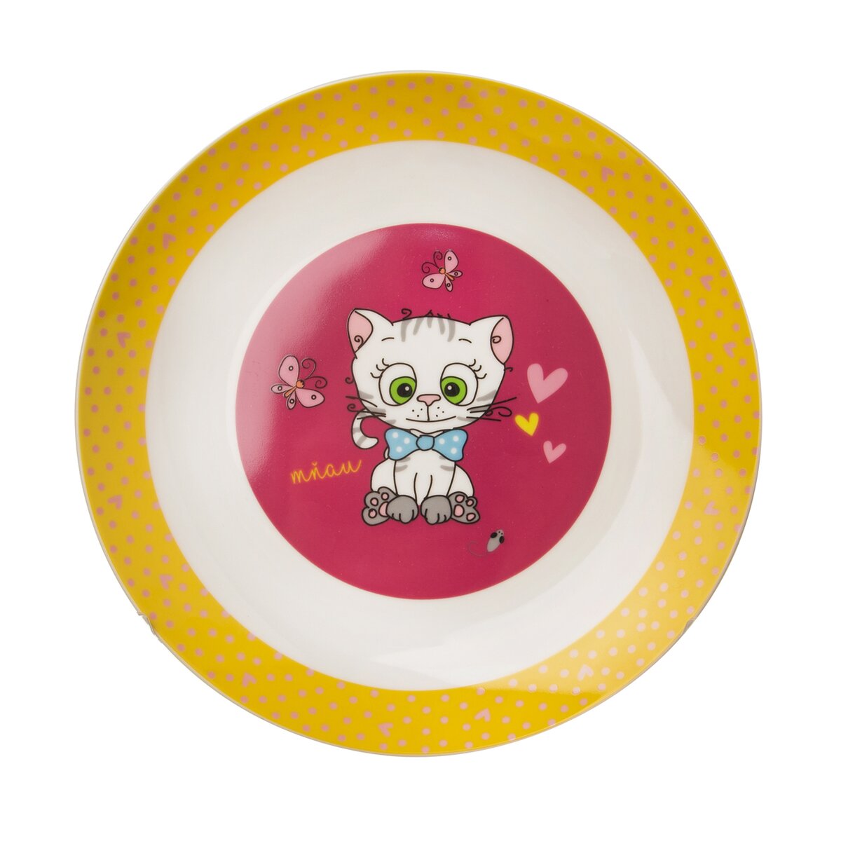 Kód produktu 128471Porcelánový mělký talíř s motivem kočičky s mašlí, o průměru 21 cm, vhodný k servírování hlavního jídla i svačiny.
