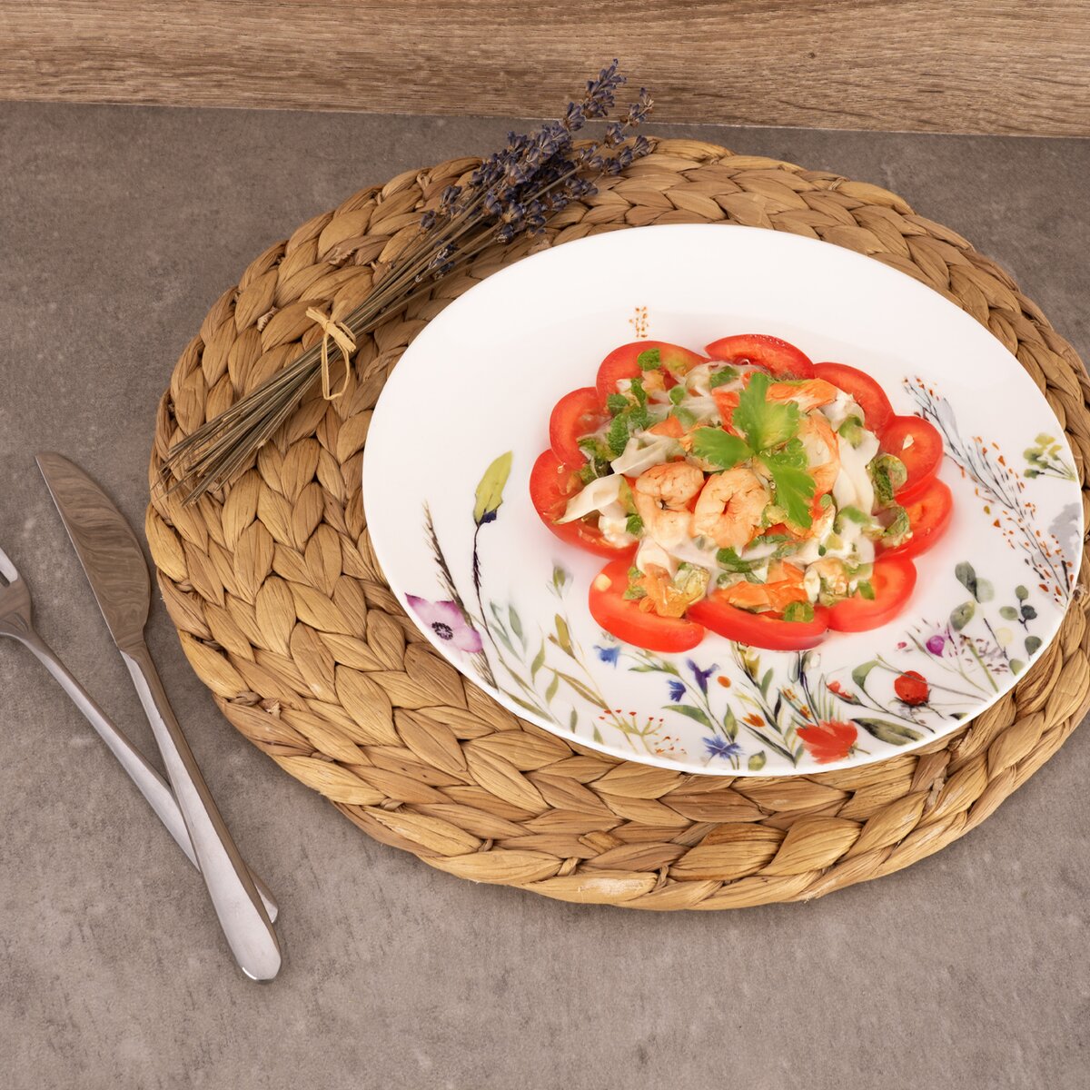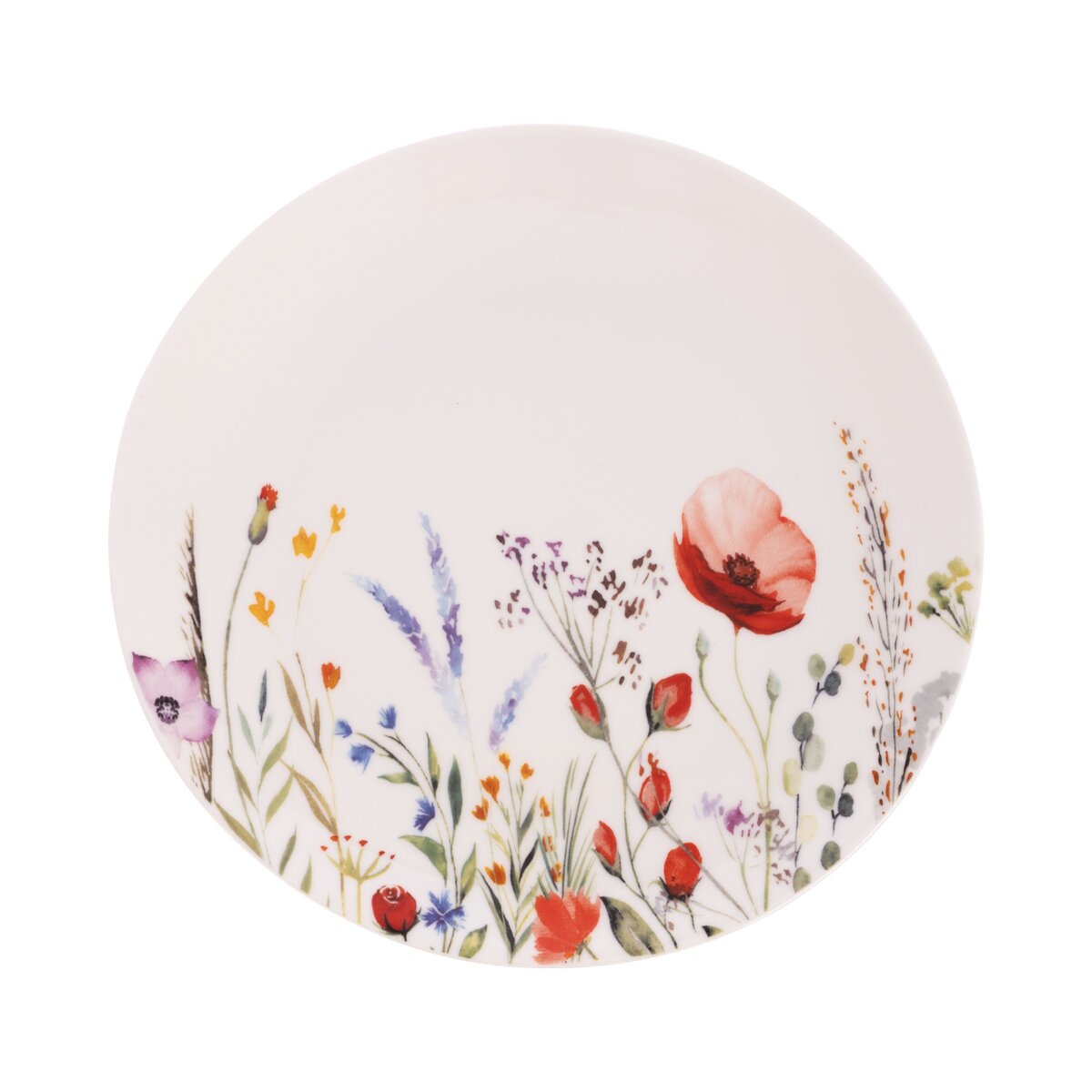 Kód produktu 129180Porcelánový mělký talíř z kolekce MÁK má průměr 24 cm a je zdoben něžným dekorem lučních květin.