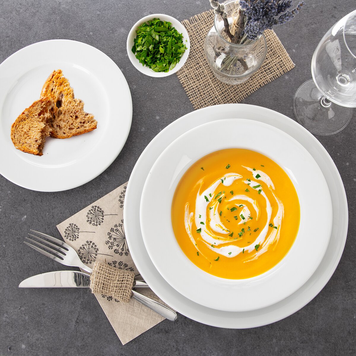 Klasický bílý talíř se hodí tam, kde je již s oblibou v podobném stylu porcelánové nádobí používáno a potřebujete doplnit stávající servis. Skvěle vypadá i v kombinaci s barevnými nebo černými talíři.