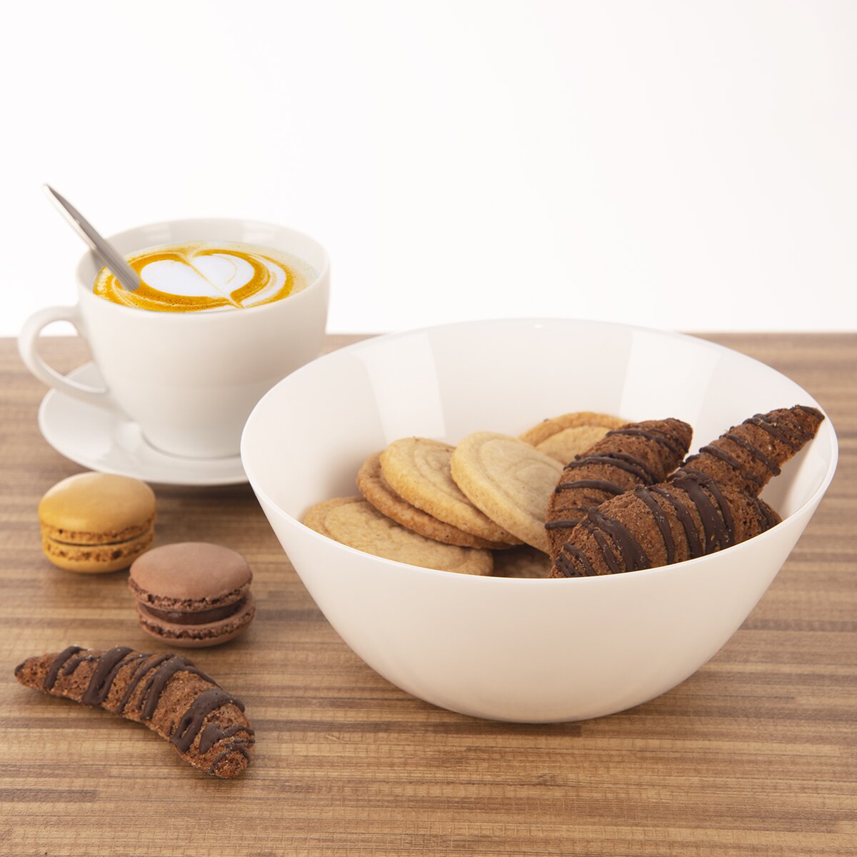 Středně velká klasika z bílého, tzv. opálového skla, to je mísa na saláty, ovoce, zeleninu, servírování drobného slaného pečiva i polévku. Má jednoduché, hladké provedení, takže se skvěle hodí i k podávání chipsů, křupek, popcornu na oslavě nebo při pohodě u oblíbeného seriálu.