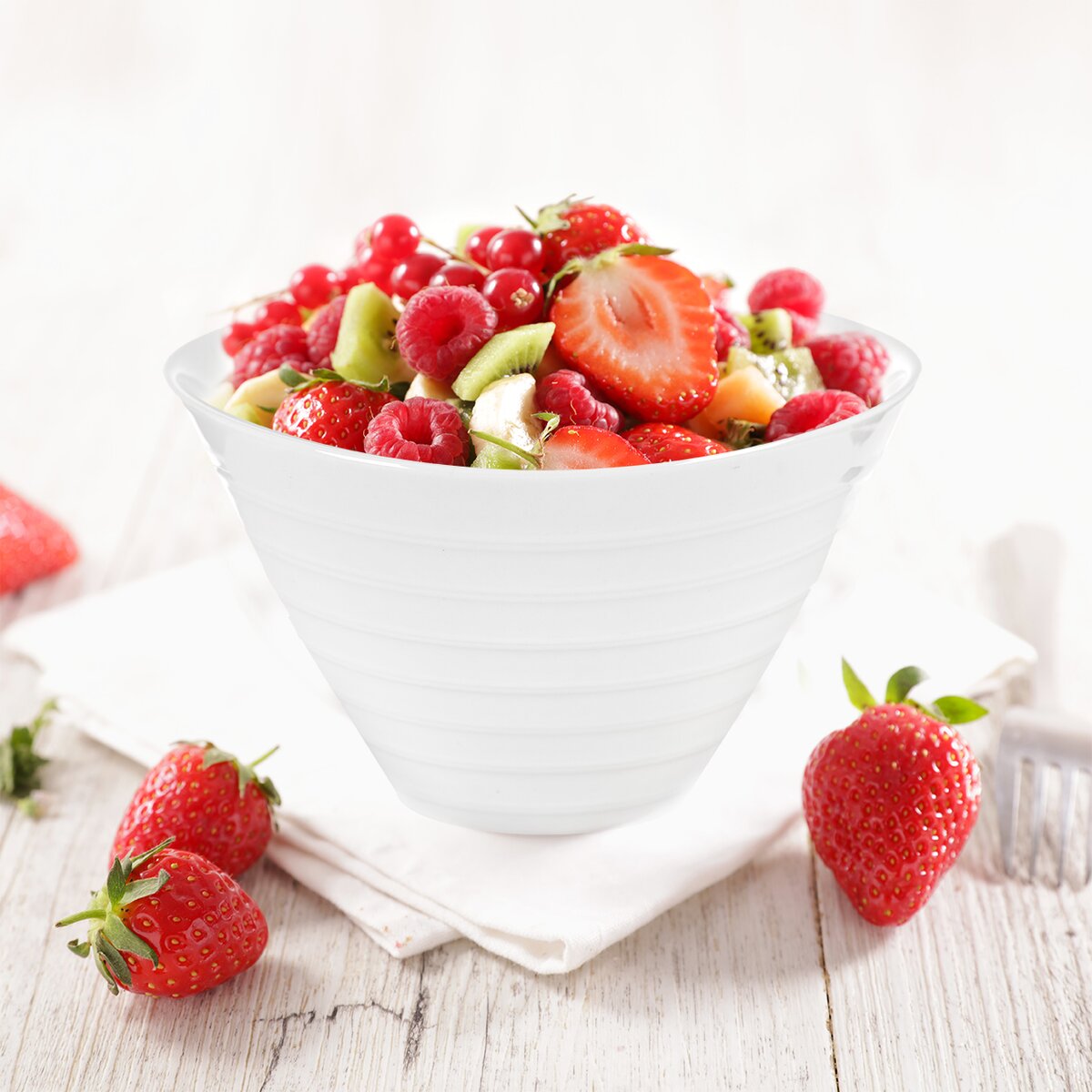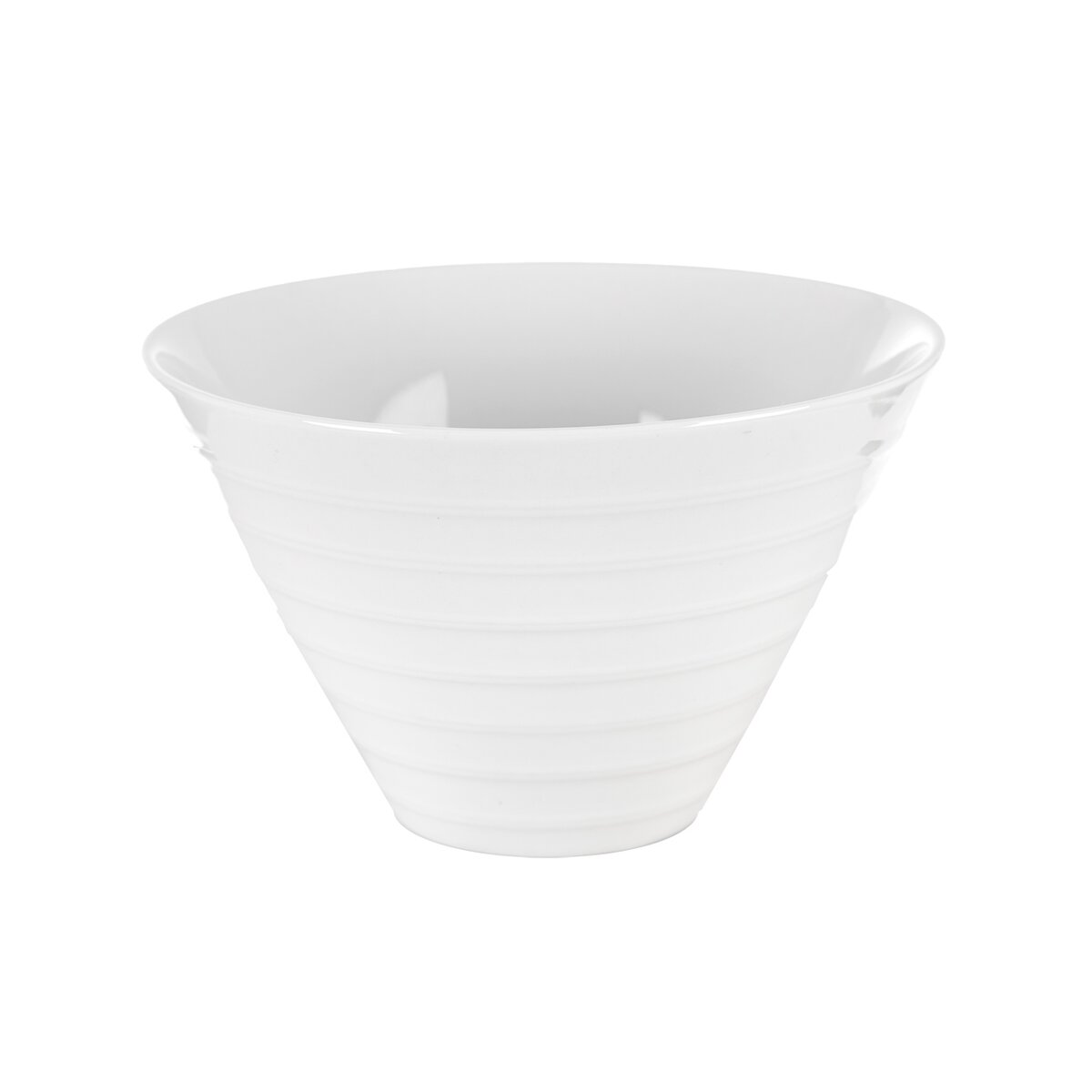 Bílá kónická miska s plastickým dekorem vodorovných vroubků z vnější strany se hodí na ledacos. Na snídaňové cereálie, čerstvé ovoce, pudink, nadýchanou pěnu i zmrzlinový pohár.