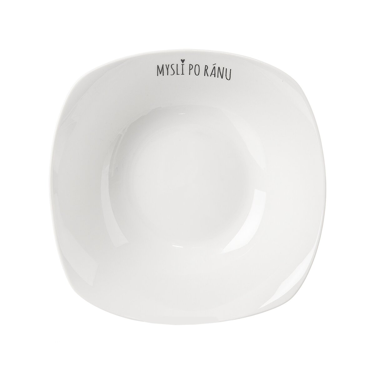 Porcelánová miska na vydatnou snídani, která Vás nastartuje na celý den. Jogurt s müsli, domácí granolu, chia pudink s ovocem, snídaňové cereálie i svěží ovocný či zeleninový salát můžete servírovat v hranaté bílé misce s nápisem "Mysli po ránu". Vykročte do nového dne s plným bříškem a dobrou náladou.