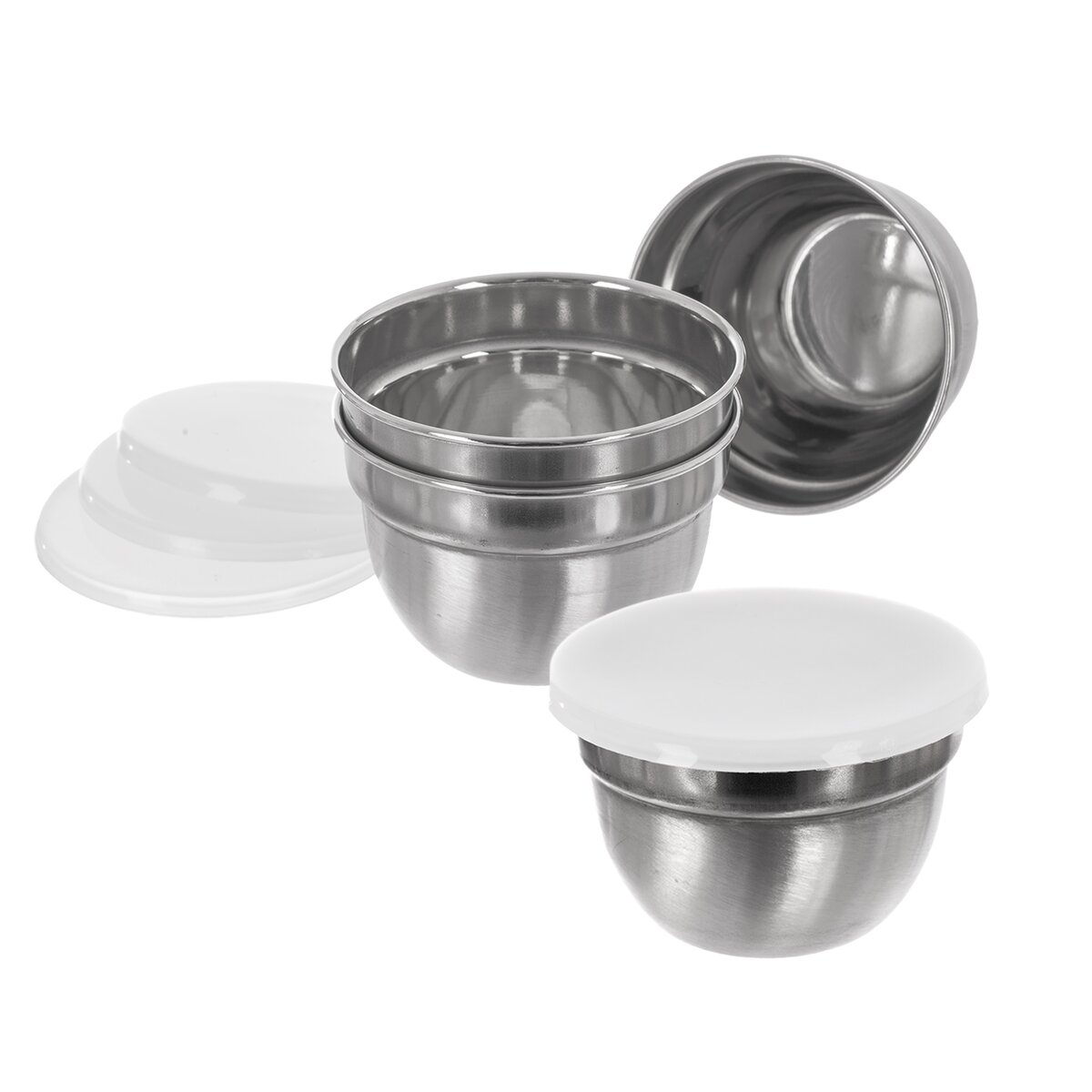Kód produktu 129269Sada 4 kusů nerezových mističek o objemu 0,2 l je doplněna plastovými víčky a hodí se k ukládání menšího množství dochucovadel, koření, dipů apod.