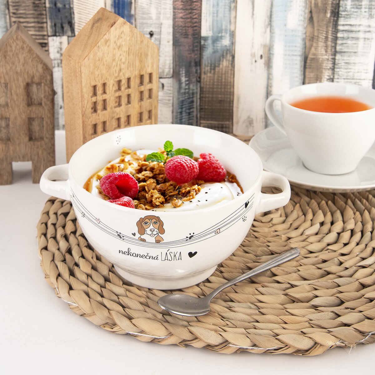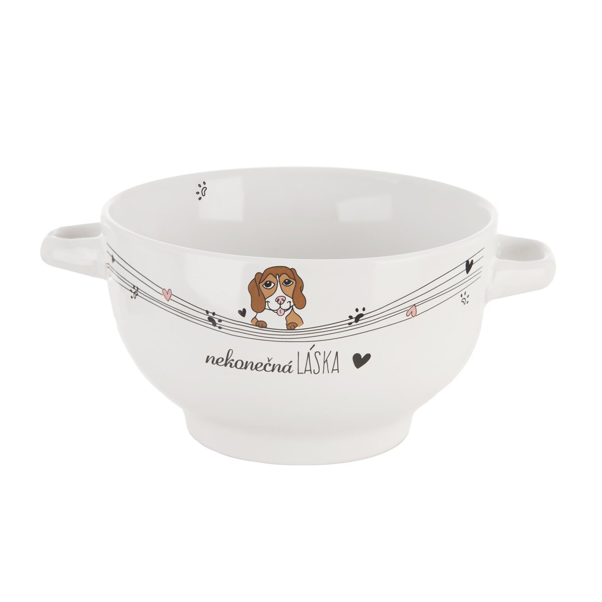 Kód produktu 129205Keramická polévková miska o objemu 0,73 l a dvěma uchy zaujme nápisem NEKONEČNÁ LÁSKA a motivem pejska.