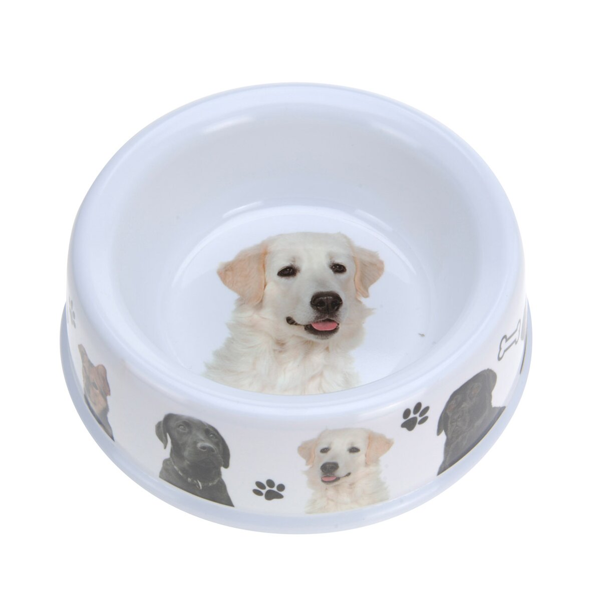 Kód produktu 124730Miska pro psy s dekorem. Materiál: melamin. Protiskluzové podložky. Rozměry : pr. 25 cm, v. 7,5 cm.