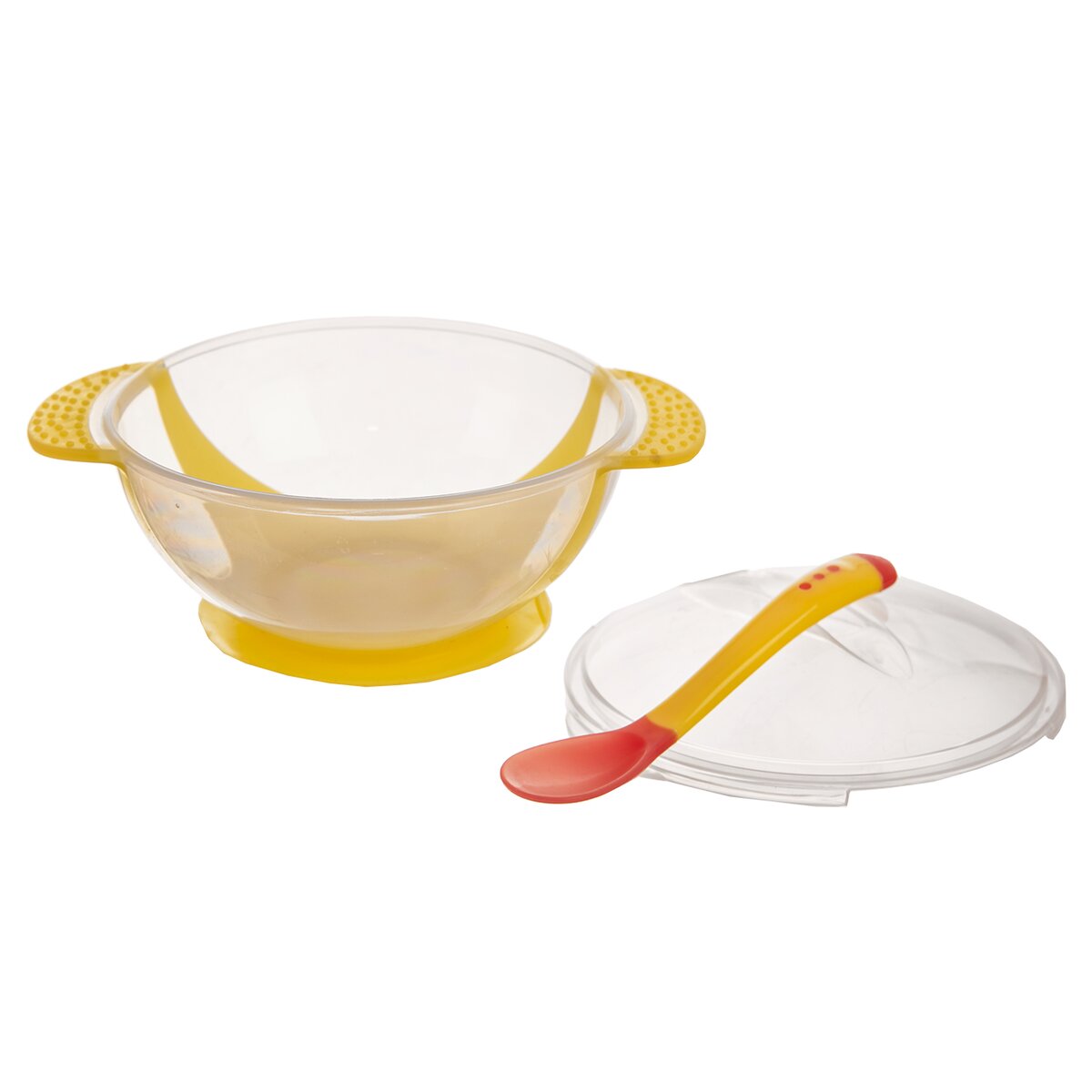 Kód produktu 129804Dětská miska s víčkem, lžičkou a s přísavkou na svačiny a přesnídávky, vyrobená z transparentního plastu se žlutými prvky, bez obsahu BPA. Je doplněna dvěma uchy, víčkem, lžičkou a ve spodní části opatřena gumovou přísavkou.