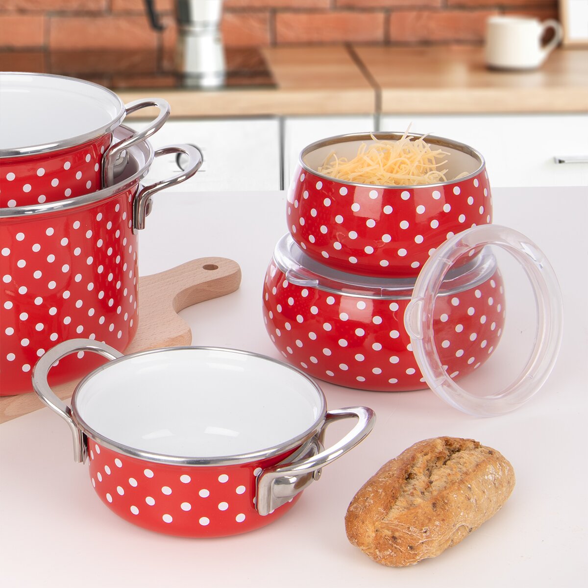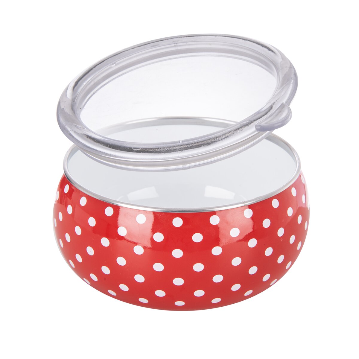 Kód produktu 129237Smaltovaná miska TEČKA o objemu 0,7 l, s nerezovým lemem a plastovým víčkem, má univerzální použití, je vhodná ke skladování, servírování i přenášení potravin, hotových jídel.