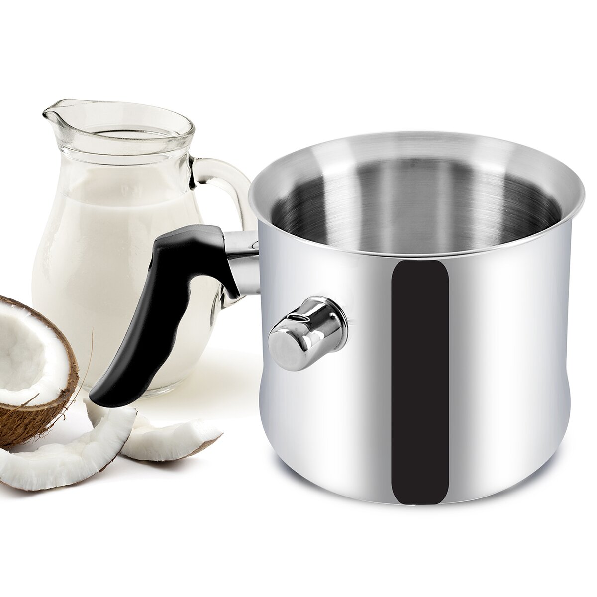 Kód produktu 111872Nerezový mlékovar o objemu 1,5 l s dvojitou stěnou a píšťalkou pomůže při vaření mléka, pudinků, rýžových nákypů a omáček, u nichž hrozí připálení.