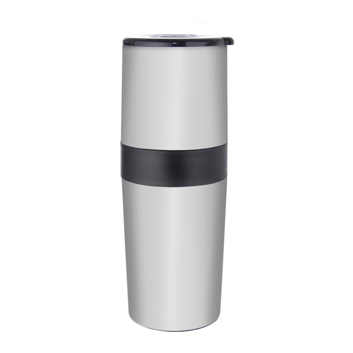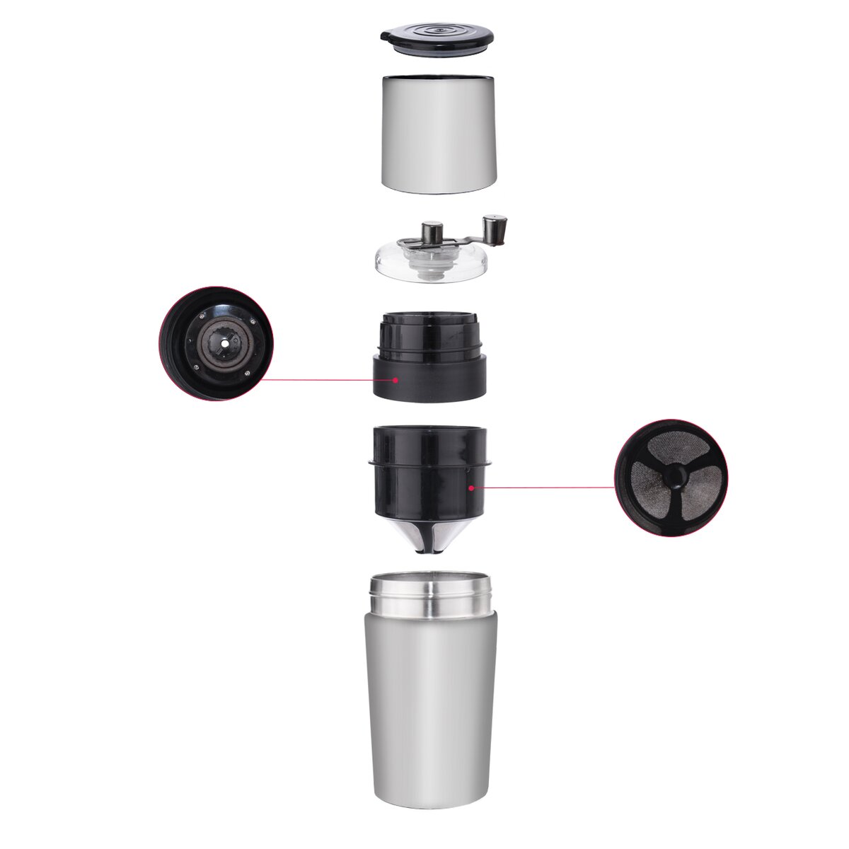 Kód produktu 130222Mechanický nerezový mlýnek na kávu s keramickým mlecím mechanismem, jehož spodní část lze využít i jako termopohár o objemu 470 ml pro zalití kávy horkou vodou, buď s použitím sítka nebo bez něho.