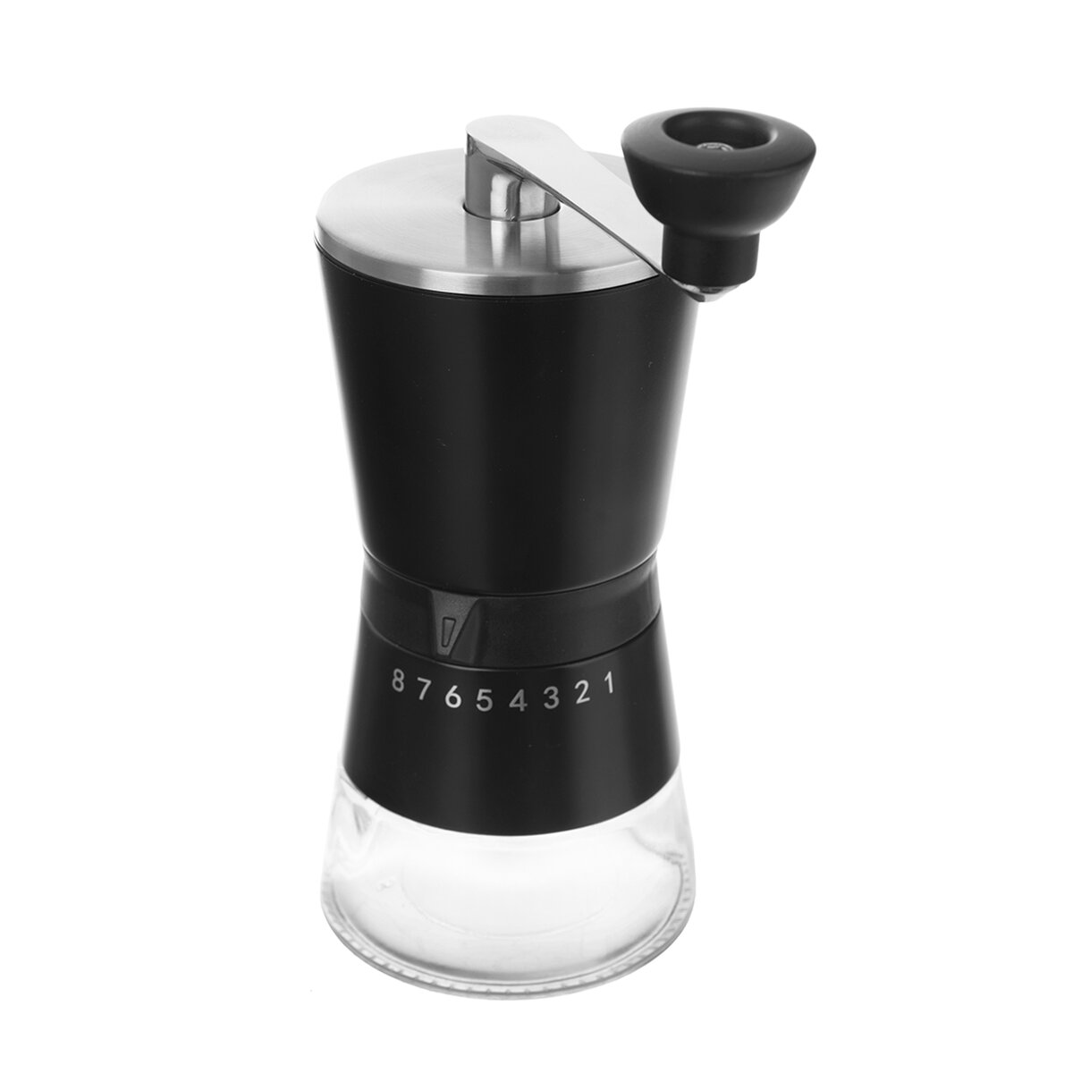 Kód produktu 130231Mechanický nerezový mlýnek na kávu v moderním provedení, s černým tělem a spodní skleněnou nádobou, pro ruční mletí zrnkové kávy pomocí keramického mlecího mechanismu.