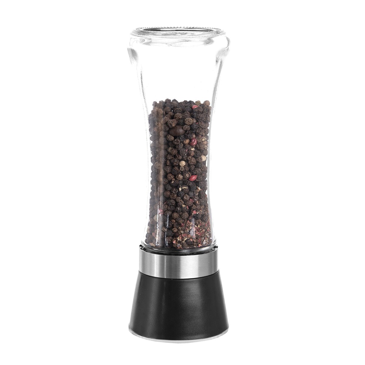 Nerezový, konvexně prohnutý mlýnek na pepř nebo sůl s transparentní skleněnou částí, který snadno čerstvě namele pepř nebo při dokončování pokrmů, ale dochutí i hotová jídla přímo u stolu.
