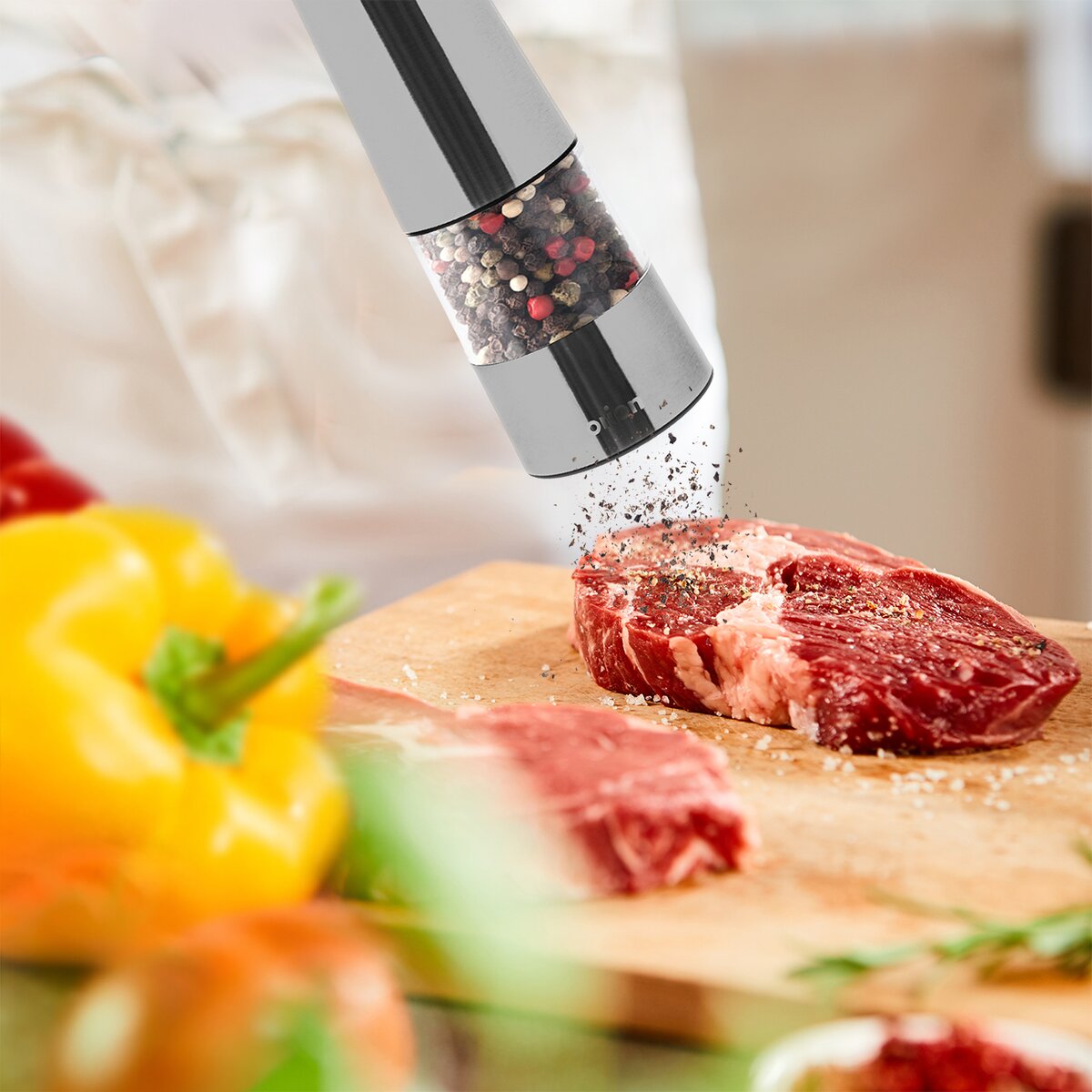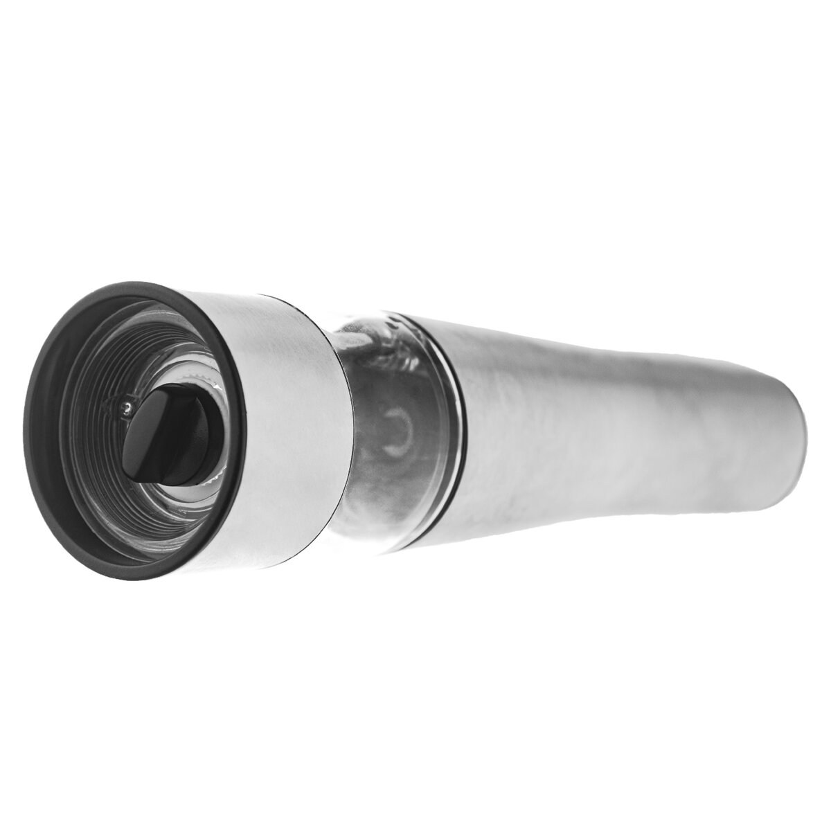 Kód produktu 130224Elegantní nerezový elektrický mlýnek na koření napájený 1,5 V AAA bateriemi, určený k dochucení pokrmů solí, pepřem nebo jiným kořením. Má keramický mlecí mechanismus a transparentní část ukazující, zda je třeba koření znovu doplnit.