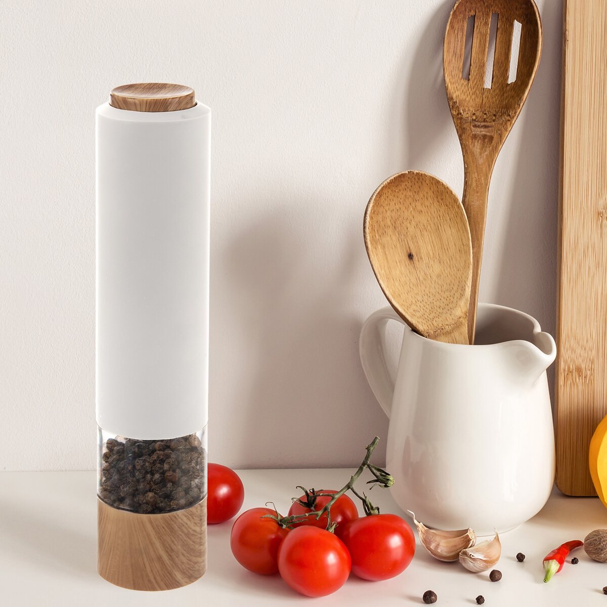 Kód produktu 130232Elegantní elektrický mlýnek na koření v kombinaci bílé barvy a plastových prvků v imitaci dřeva. Je napájený 1,5 V AA bateriemi a určený k dochucení pokrmů solí, pepřem nebo jiným kořením. Má keramický mlecí mechanismus a LED osvětlení.