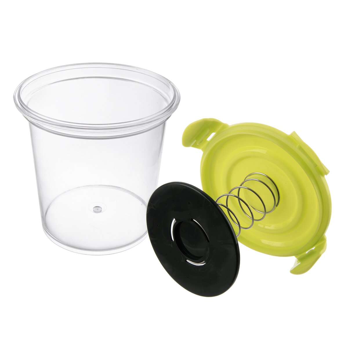 Má objem 1,8 l. Víčko s nerezovou pružinou umožňuje stlačení potravin, čímž snižuje spotřebu marinády nebo oleje a napomáhá zvýraznit jejich chuť, zejména sýry se lépe proleží a v oleji se zakonzervují do doby, než bude ten správný čas k jejich konzumaci.