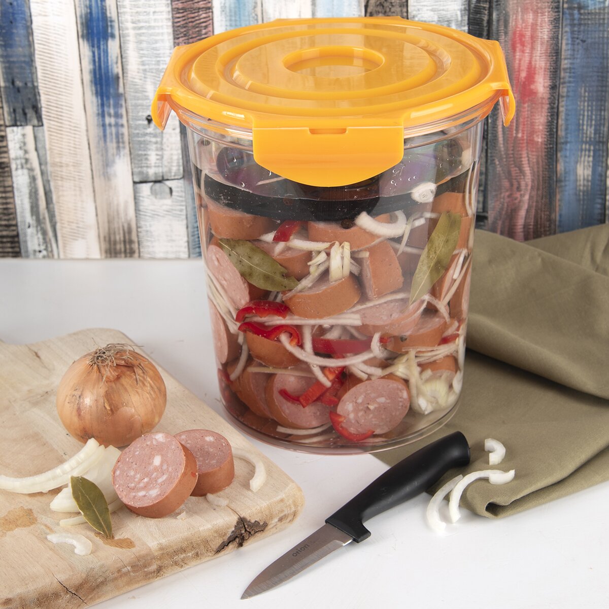 Kód produktu 124685Plastová transparentní dóza o objemu 4 l na marinování a nakládání potravin. Součástí je i pružinové víčko opatřené 4 pevnými klipy.