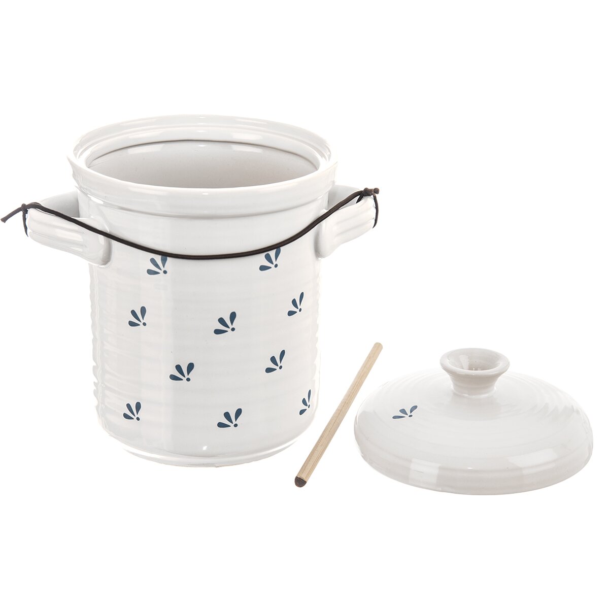 Kód produktu 127604Keramický hrnec MODROBÍLÁ o objemu 2,8 l je opatřen poklicí, gumičkou, dřevěnou tyčkou a vnitřním těžítkem. Je určen k přípravě výborné nakládané zeleniny, tzv. pickles.