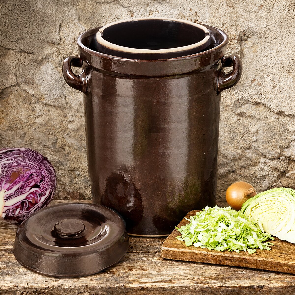 Kód produktu 113399Glazovaný keramický hrnec s poklicí od českého výrobce má objem 15 l a je vhodný na nakládání zelí, kvašených okurek a dalších pochoutek. Je opatřen žlábkem na vodu, který umožní správný proces kvašení.