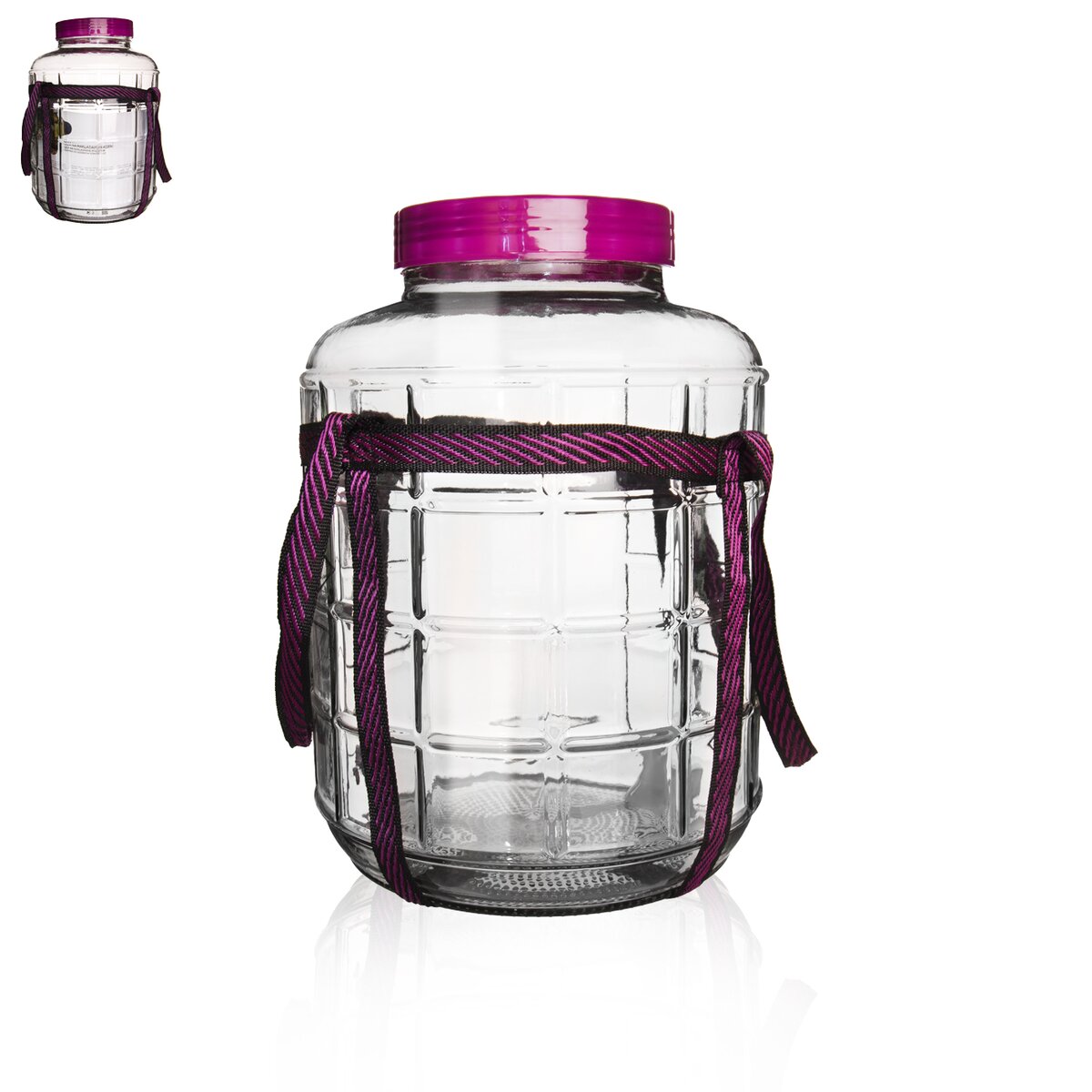 Skleněná dóza s plastovým víkem na závit a se dvěma uzávěry - jeden dózu pevně uzavře a dóza uchová a bezpečně přepraví tekutiny, druhý je opatřen otvory a po zalití žlábku ve víku vodou zajišťuje proces kvašení. Díky tomu v něm můžete připravit kvašené okurky, víno, zelí. Nahradí klasické demižony a hrnce na kvašení. Materiál: sklo, plast. Je opatřen popruhy pro pohodlné přemisťování. Rozměry: objem 9 l, pr. 22 cm, v. 31 cm.