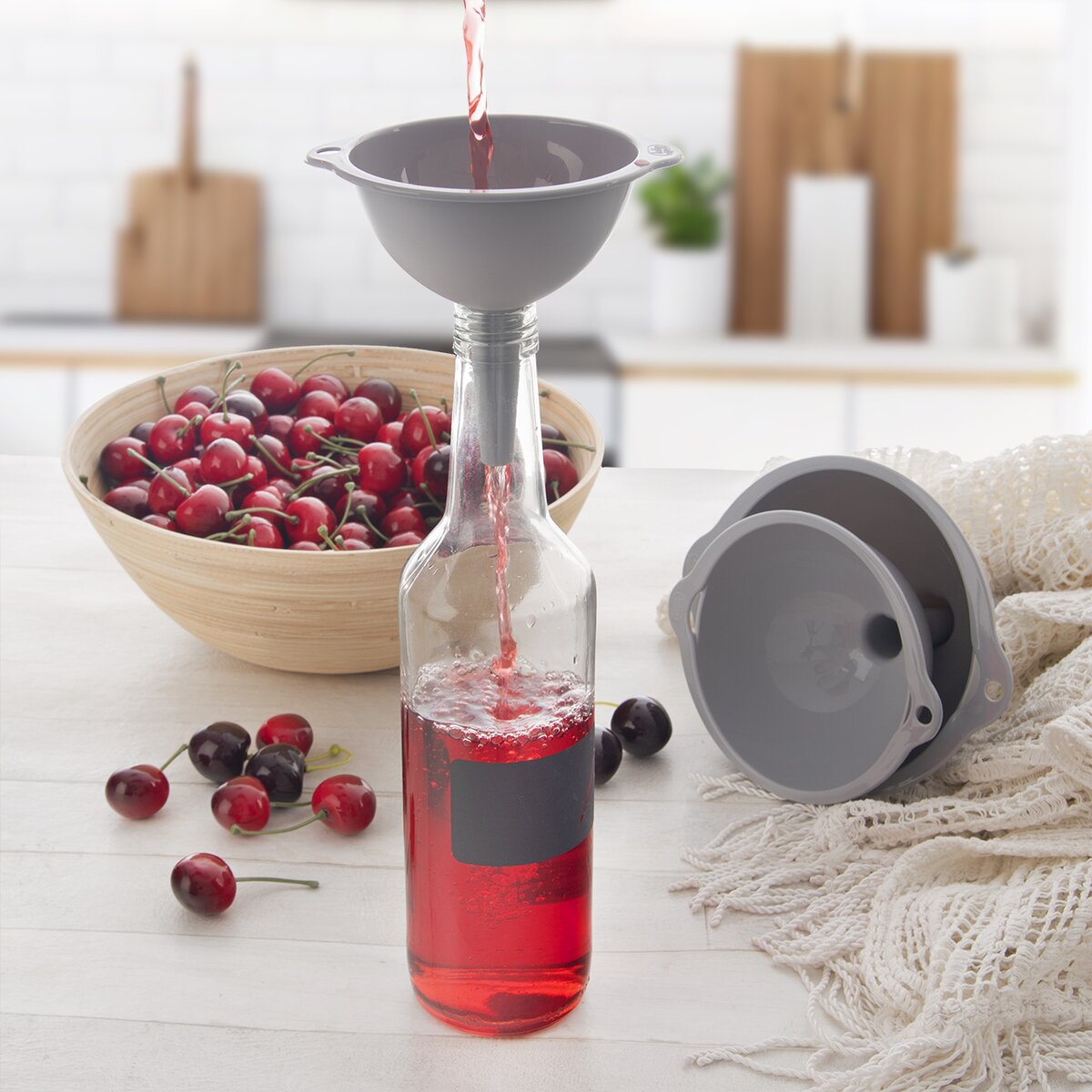 Kód produktu 120455Sada 3 kusů plastových nálevek průměru 10, 12 a 14 cm pro přesnější nalévání různých tekutin, sirupů, šťáv, oleje, čaje, ale i láku při zavařování.