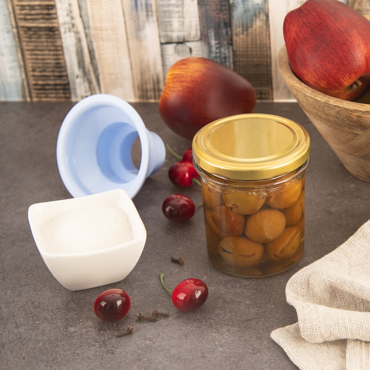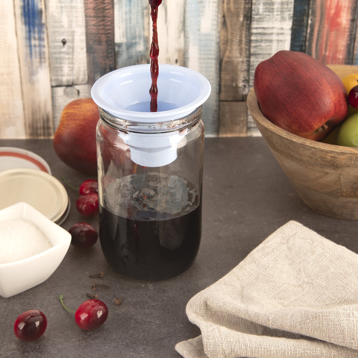 Tahle plastová nálevka o horním průměru 9 cm je vhodná i k plnění skleniček domácím jogurtem nebo paštikou před ztuhnutím. Průměr otvoru v dolní, zužující se části je 3,5 cm.