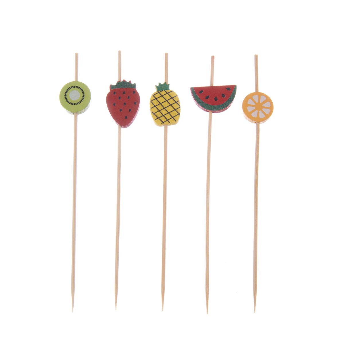 Kód produktu 151614Bambusová napichovátka s barevnou ozdobou ve tvaru OVOCE využijete při servírování drobného slaného nebo sladkého pohoštění při různých příležitostech. Jsou v sadě 20 ks a mají délku 12 cm.
