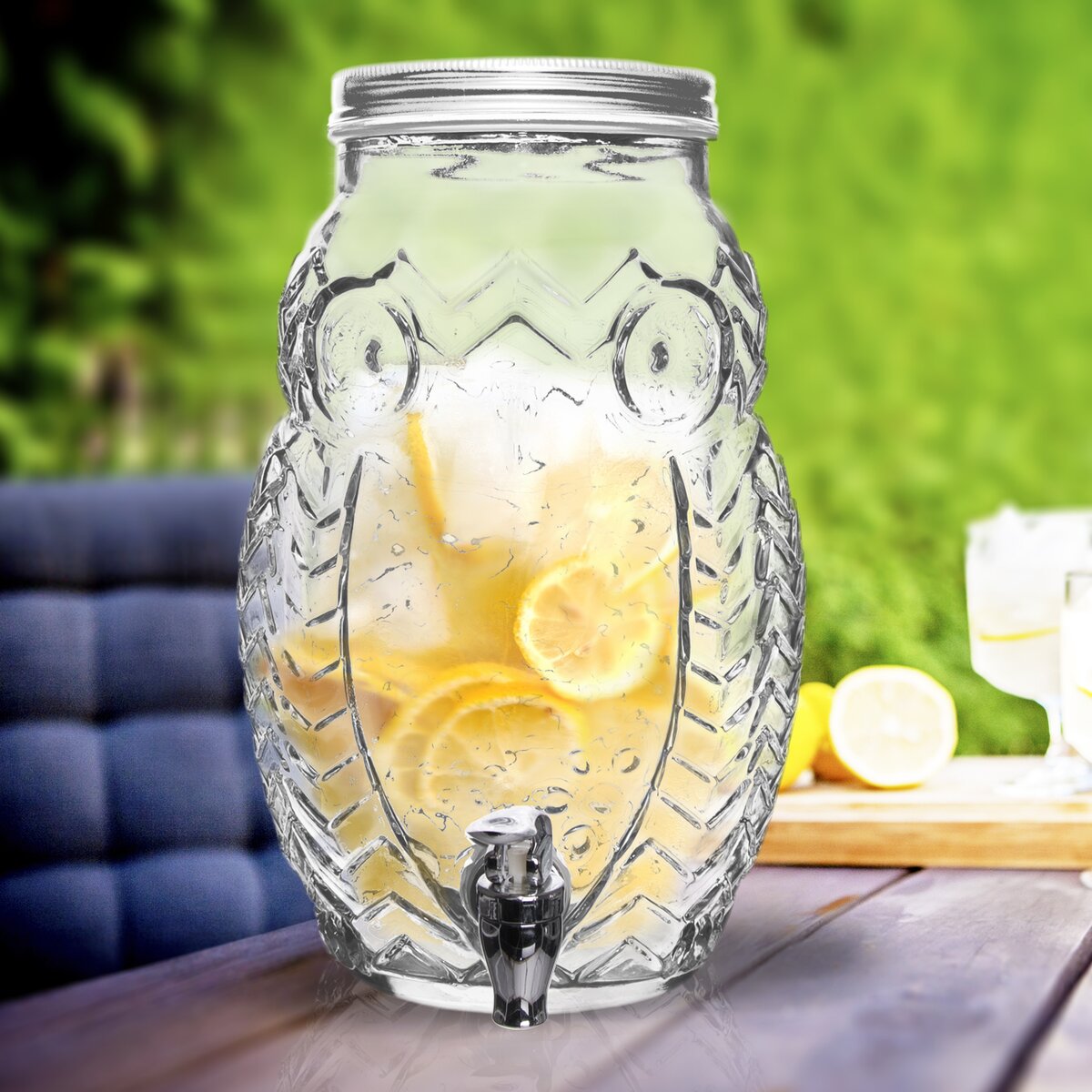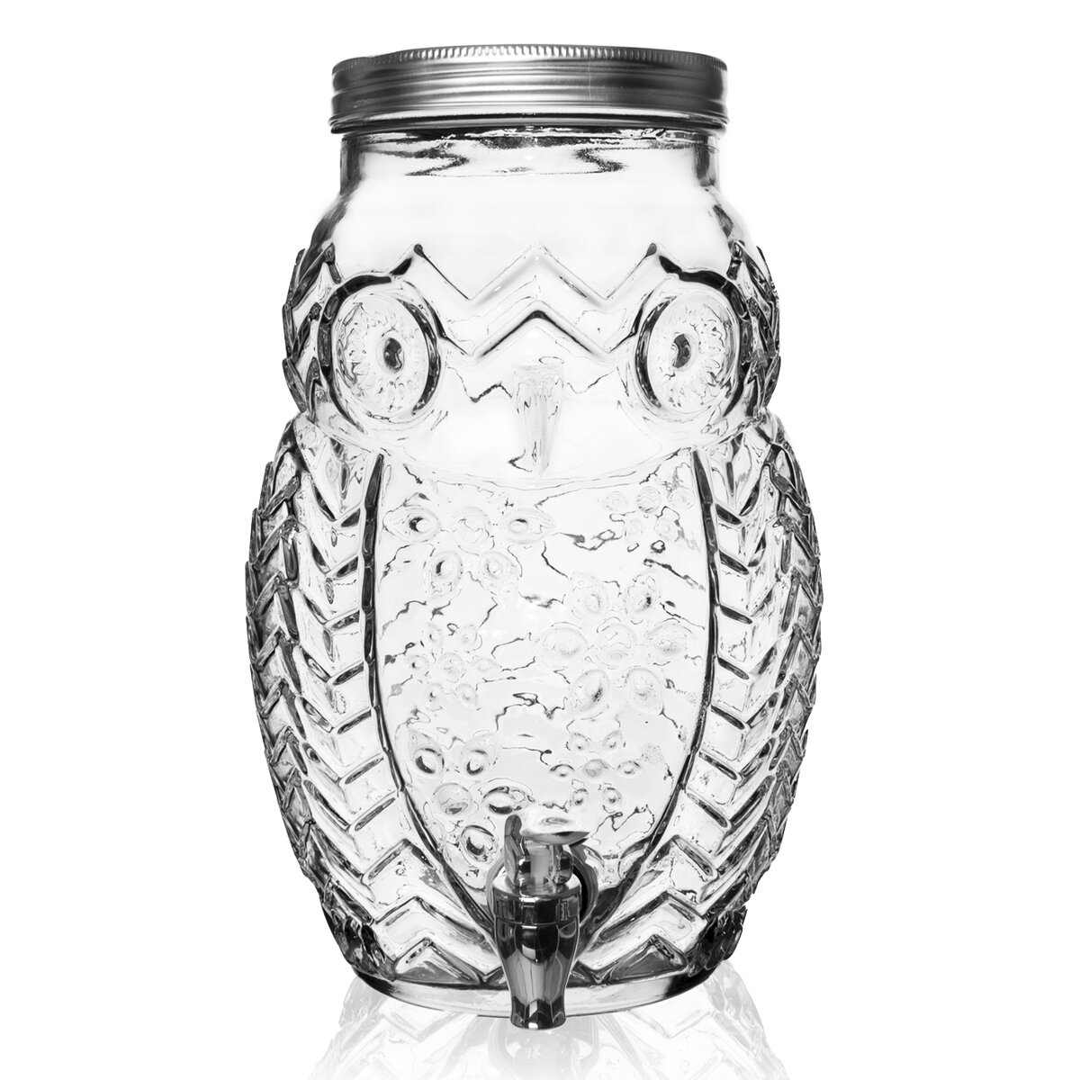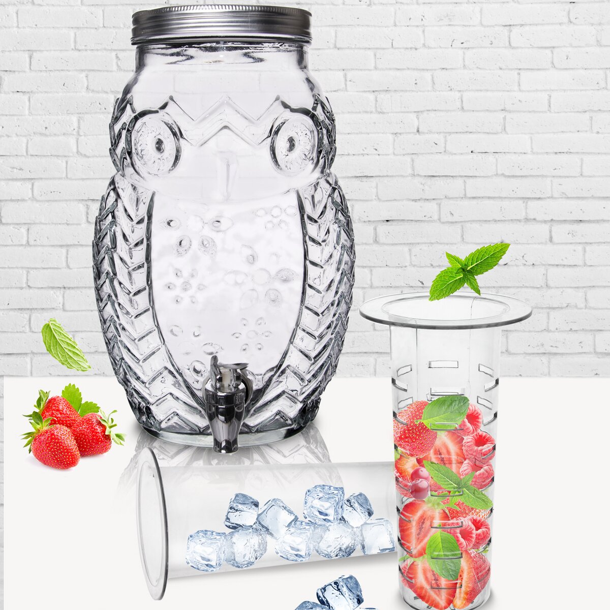 Láhev s kohoutkem na vypouštění tekutiny je vhodná na různé party bowle, ovocné šťávy, limonády. Široký plnící otvor pro snadné vkládání a vybírání ovoce i pro mytí, kovové víčko na závit. Materiál: sklo, kov, plast, silikonové těsnění. Zásobník není vhodný pro horké tekutiny. Rozměry: objem 5,2 l, pr. 19 cm, v. 30 cm.