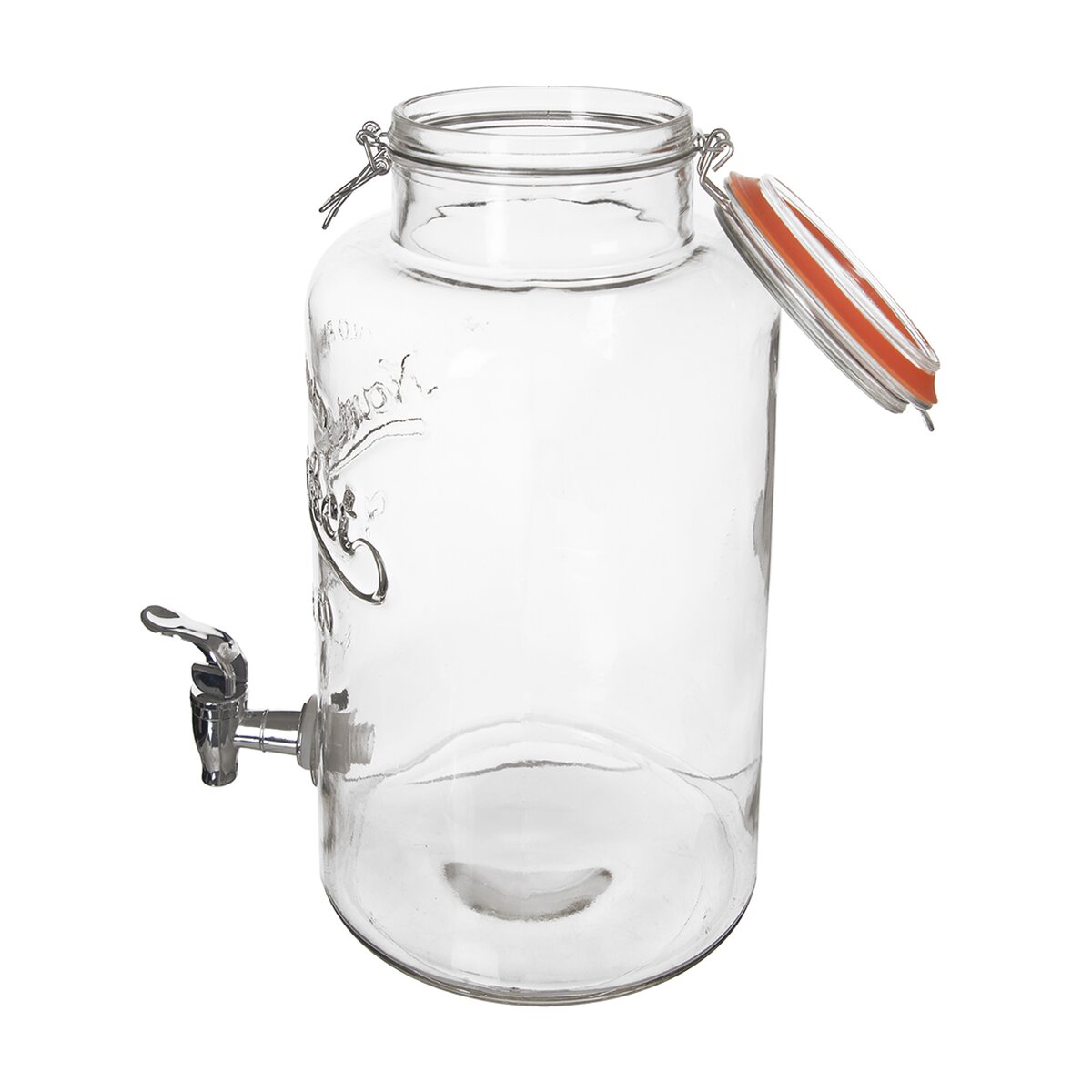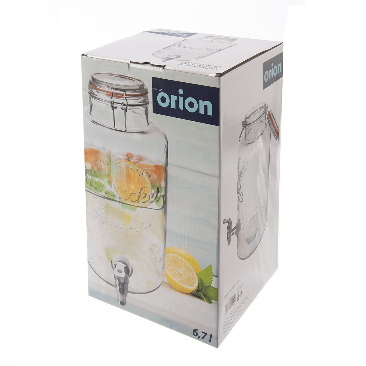 Kód produktu 143778Skleněná láhev na vodu a jiné nápoje, o objemu 6,7 l, zaujme plastickým dekorem a uzavíráním hrdla na klip. Dávkování nápojů usnadní praktický kohoutek.