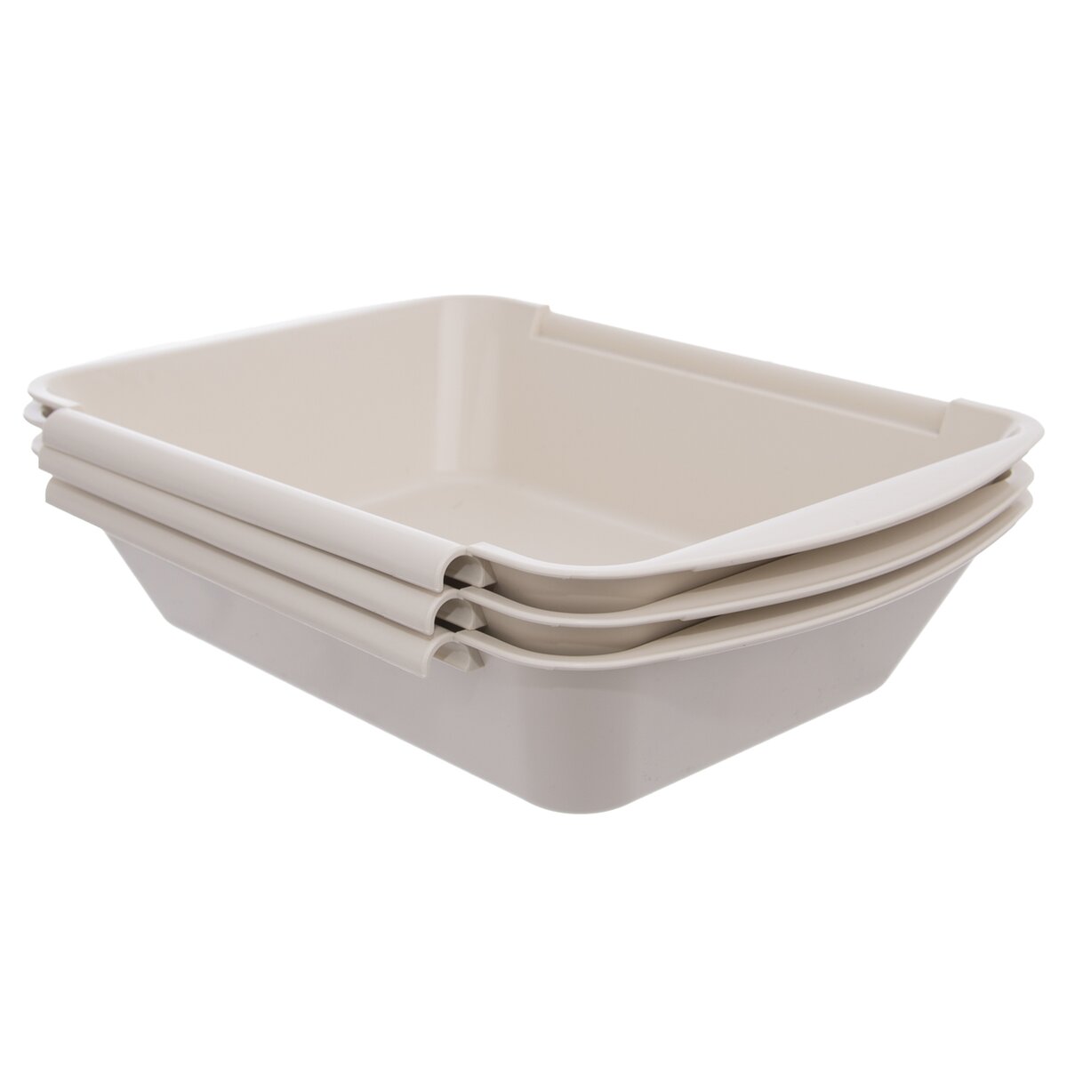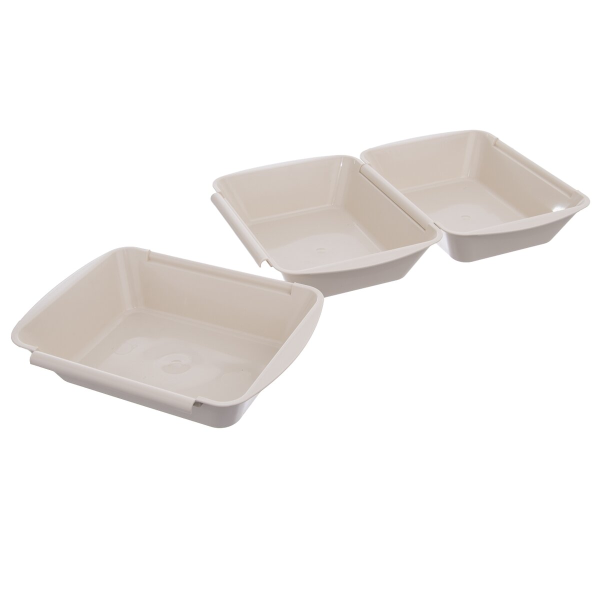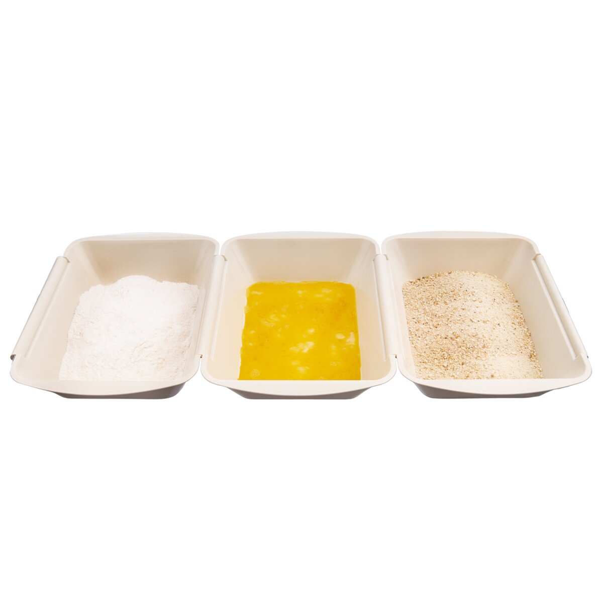 Kód produktu 128372Set tří plastových misek určených k obalování řízků v trojobale. Každá miska má rozměry 26×20×5,5 cm.