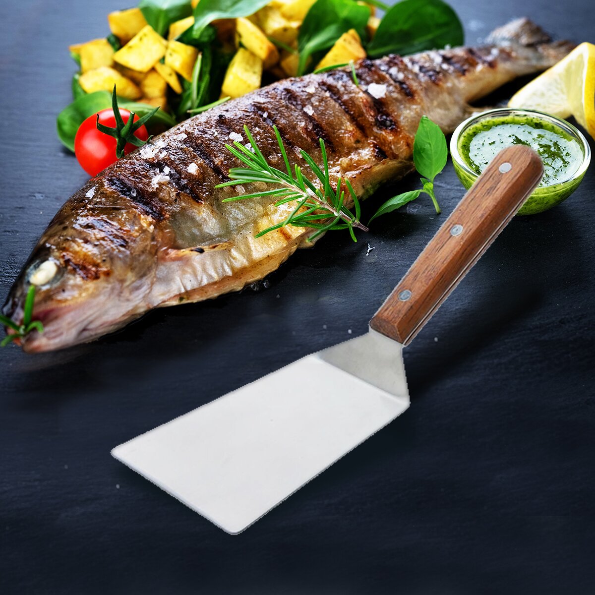 Kód produktu 140337Plochá nerezová obracečka s dřevěnou rukojetí pro otáčení masa, ryb při grilování, v kuchyni při otáčení karbanátků, placek a servírování moučníků nebo lasagní.