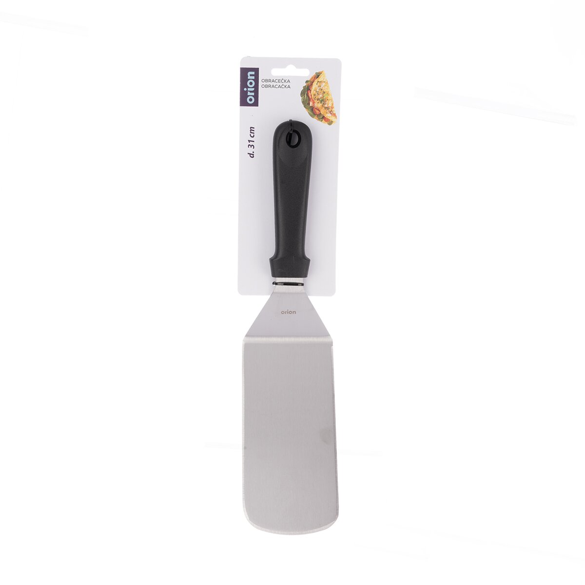 Kód produktu 140359Plochá nerezová obracečka s plastovou rukojetí o celkové délce 33 cm je určena pro otáčení masa a ryb při grilování, v kuchyni při otáčení karbanátků či hamburgerů a servírování buchet, moučníků nebo lasagní.