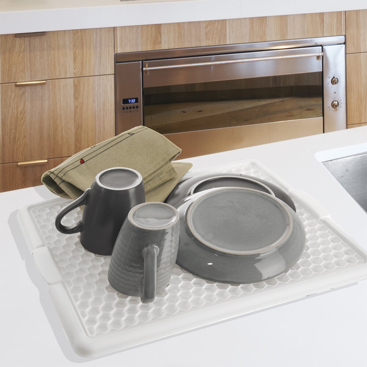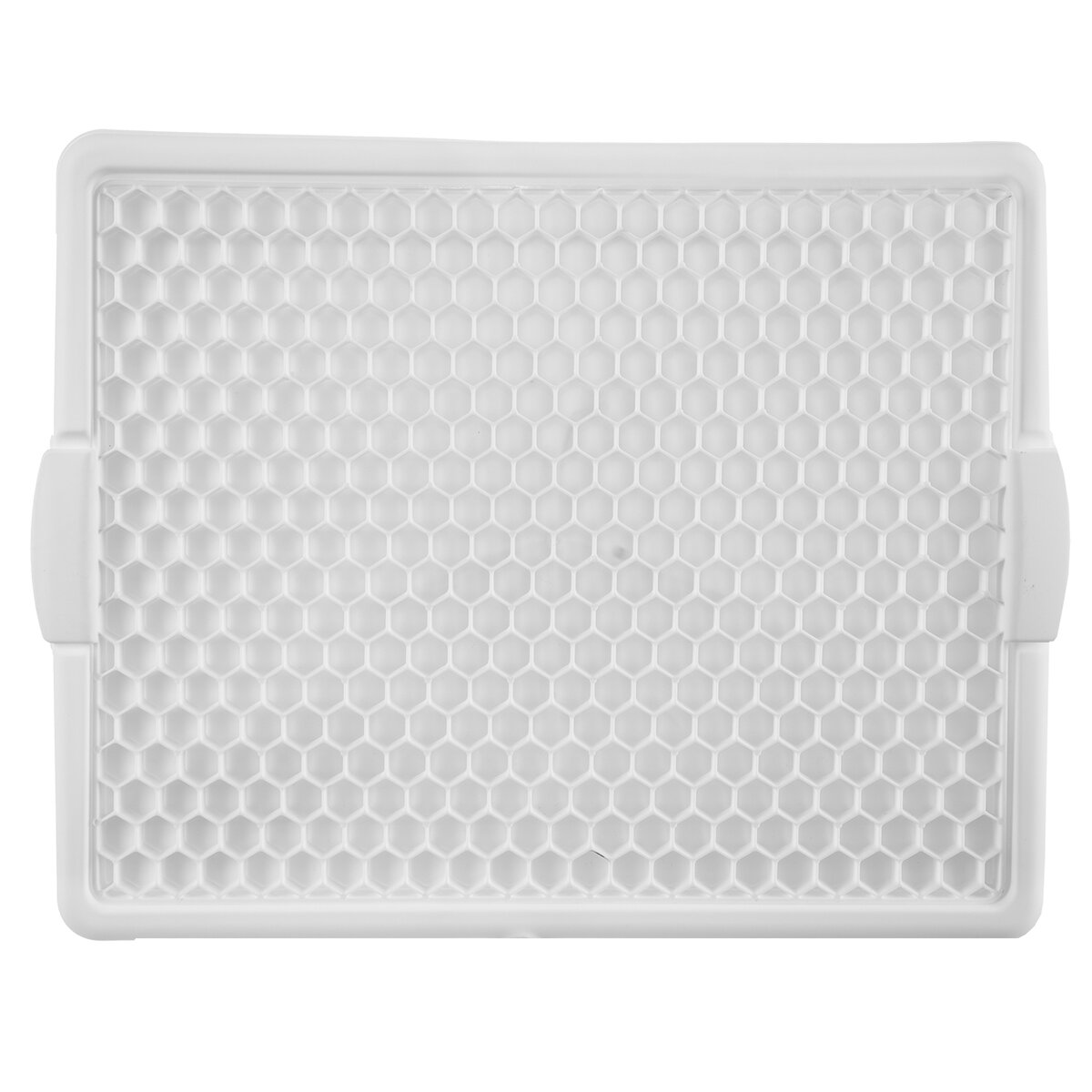 Kód produktu 150693Bílá odkapávací podložka na nádobí o rozměrech 42,3×33,2×1,6 cm s vnitřní plastovou mřížkou.