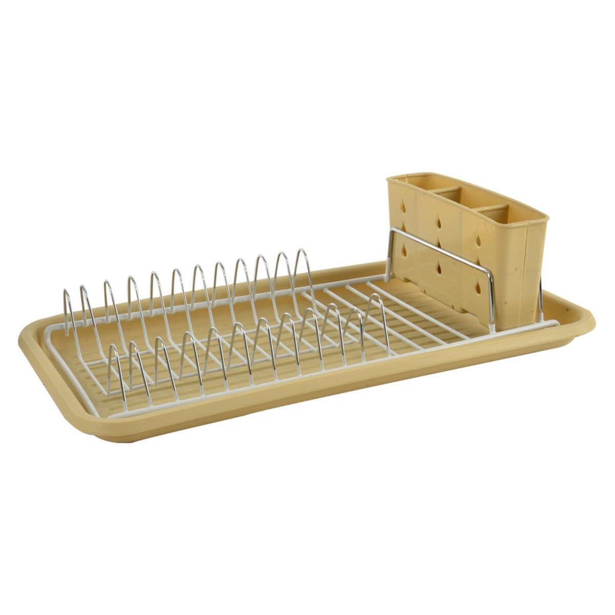 Kód produktu 150681Béžový plastový odkapávač na nádobí s drátěnou konstrukcí, o rozměrech 43×23×12 cm.