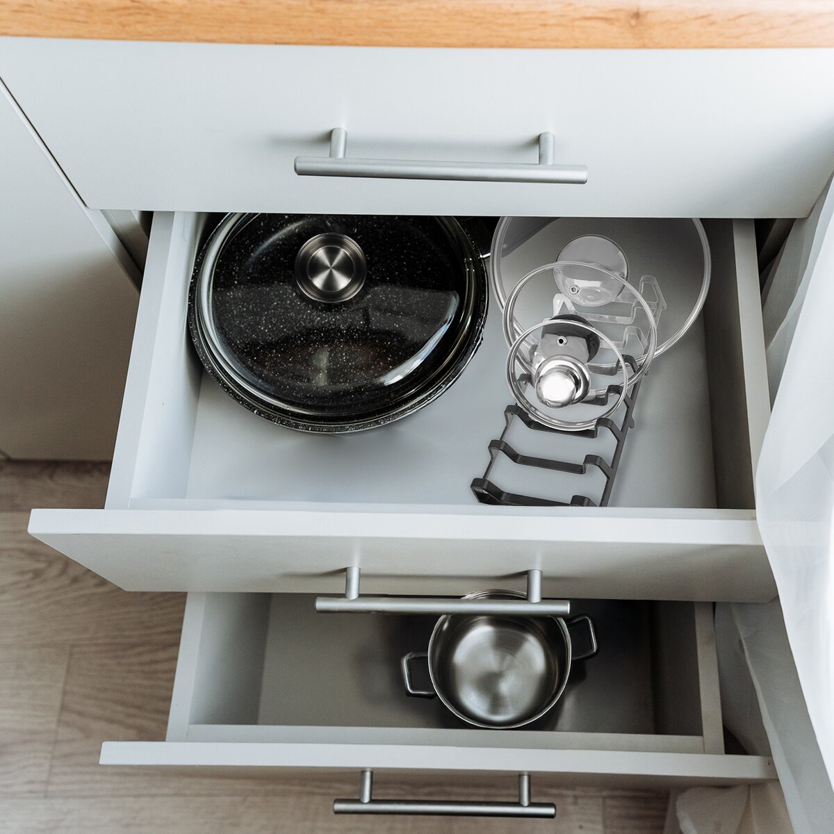 Navíc jej lze použít i k uložení poklic nebo prkének v hlubší kuchyňské zásuvce. Udrží kuchyňské náčiní přehledně uspořádané a šetří místo.